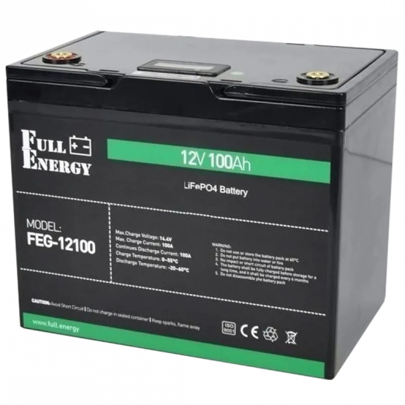 Літій-залізо-фосфатний акумулятор FEG-12100 виконаний у герметичному корпусі та виготовлений за технологією LiFePO4. У технології використовується мінерал сімейства олівін – він зустрічається у природному середовищі, не токсичний, термостійкий. Місткість - 100 A•год / 1280 Вт•год. Напруга – 12.8 В. Габаритні розміри – 330х173х217мм. Вбудований LCD екран із зазначенням рівня заряду акумулятора.