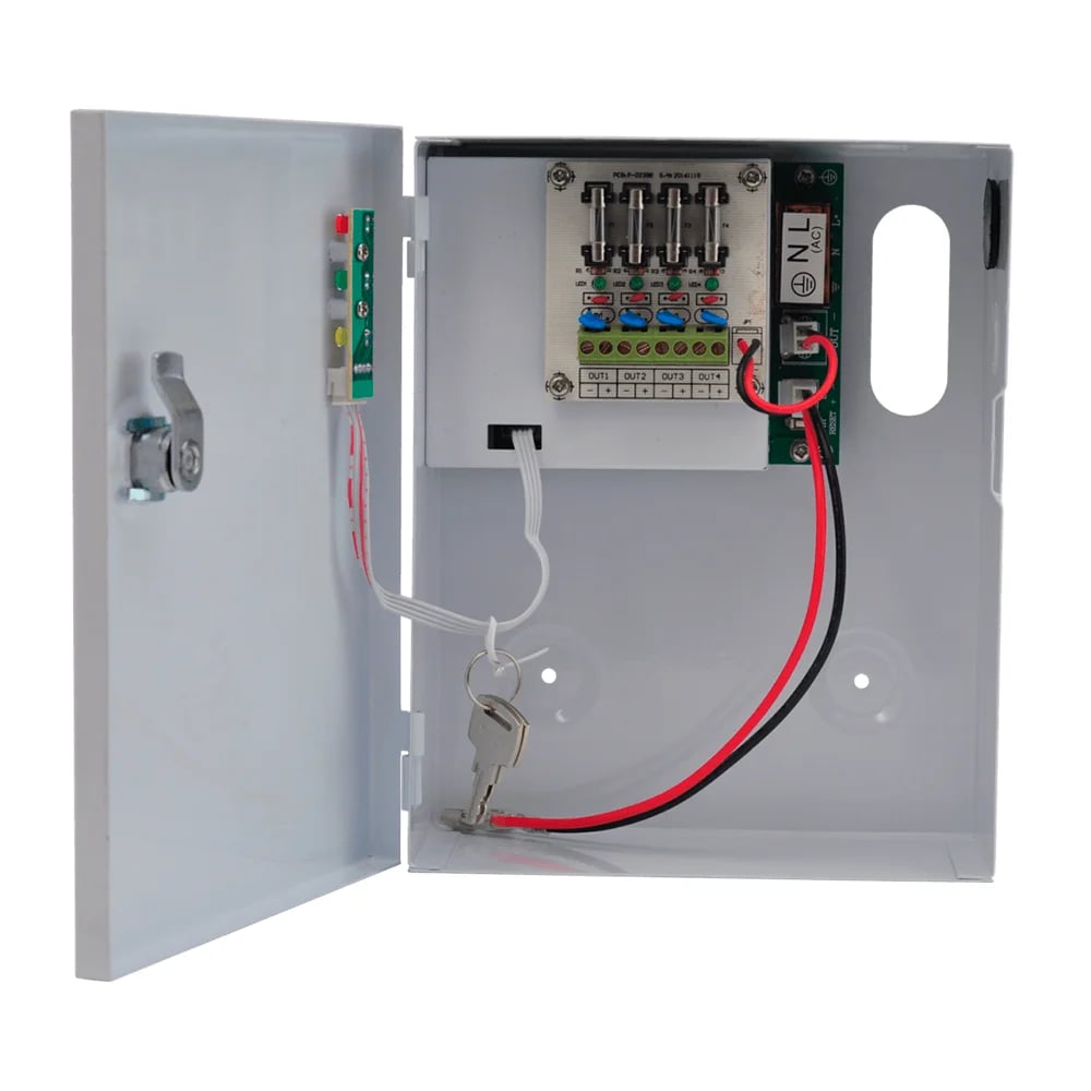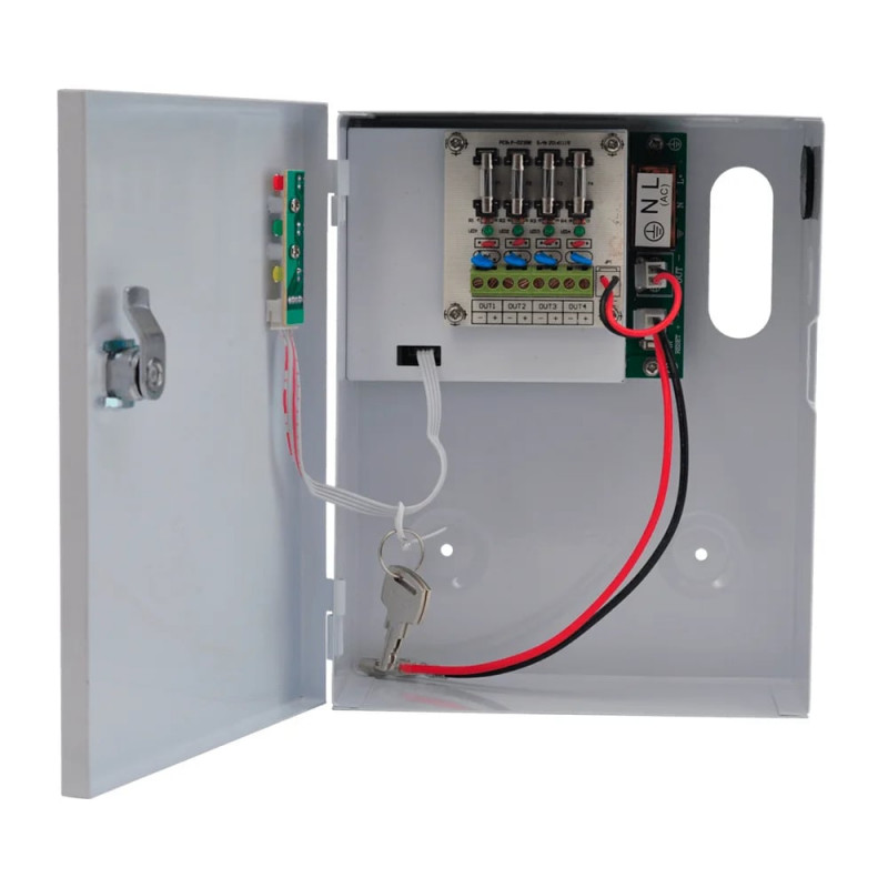 Блок безперебійного живлення імпульсний з 4 каналами навантаження, LED-індикацією; номінальна вихідна напруга 12 В; вихідний струм номінальний 3 A, максимальний 3.6 А; вхідна напруга 190-265 В, 50-60 Гц; місце під акумуляторну батарею 7 Аг; струм заряду акумуляторної батареї 1.2 А; металевий бокс; 160 / 200 / 70 мм