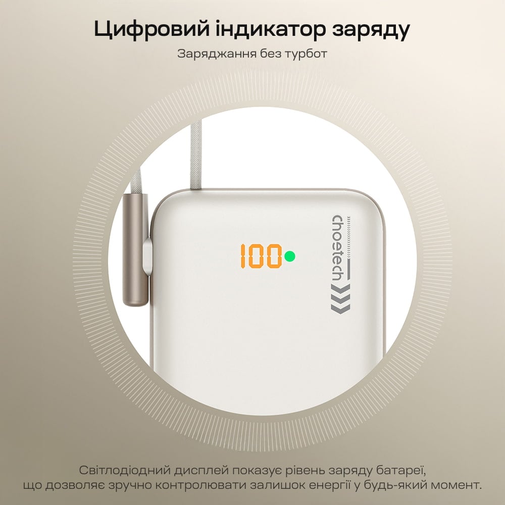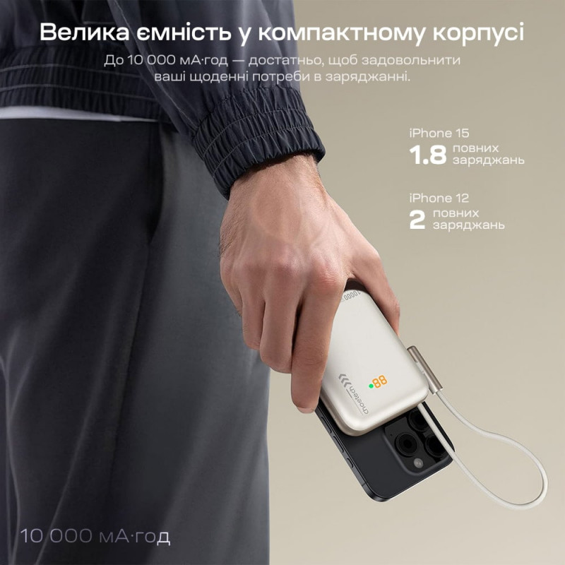 Повербанк з ємністю батареї 10000 мА·год, з бездротовою магнітною зарядкою, з вбудованим кабелем; тип батареї: літій-полімерна (Li-pol); інтерфейси: вхід Type-C: 5V/2.4A, 9V/2A, 12V/1.5A (макс. 18 Вт), виходи: Type-C: 5V/3A, 9V/2.22A, 12V/1.67A (макс. 20 Вт); Type-C кабель: 5V/3A, 9V/2.22A, 12V/1.67A (макс. 20 Вт); бездротова зарядка: 5V/1A, 5V/1.5A, 5V/2A, 5V/3A (макс. 15 Вт); LED-дисплей, підставка; протоколи швидкого заряджання PD3.0 / QC3.0 / AFC / FCP / Apple2.4A; розміри 113 / 72 / 20 мм; кабель USB-C to USB-C в комплекті