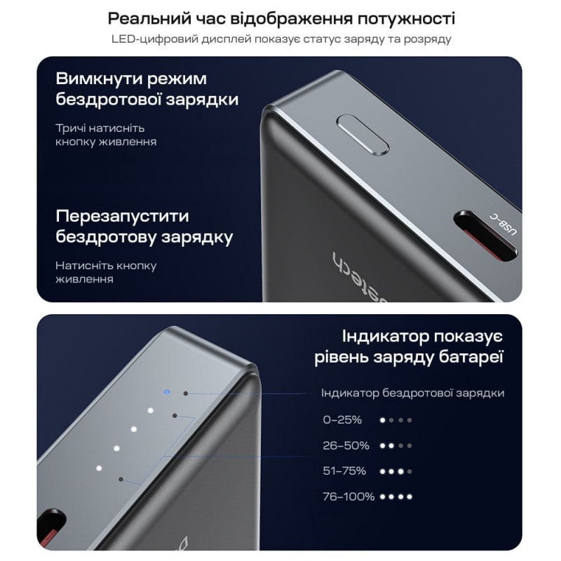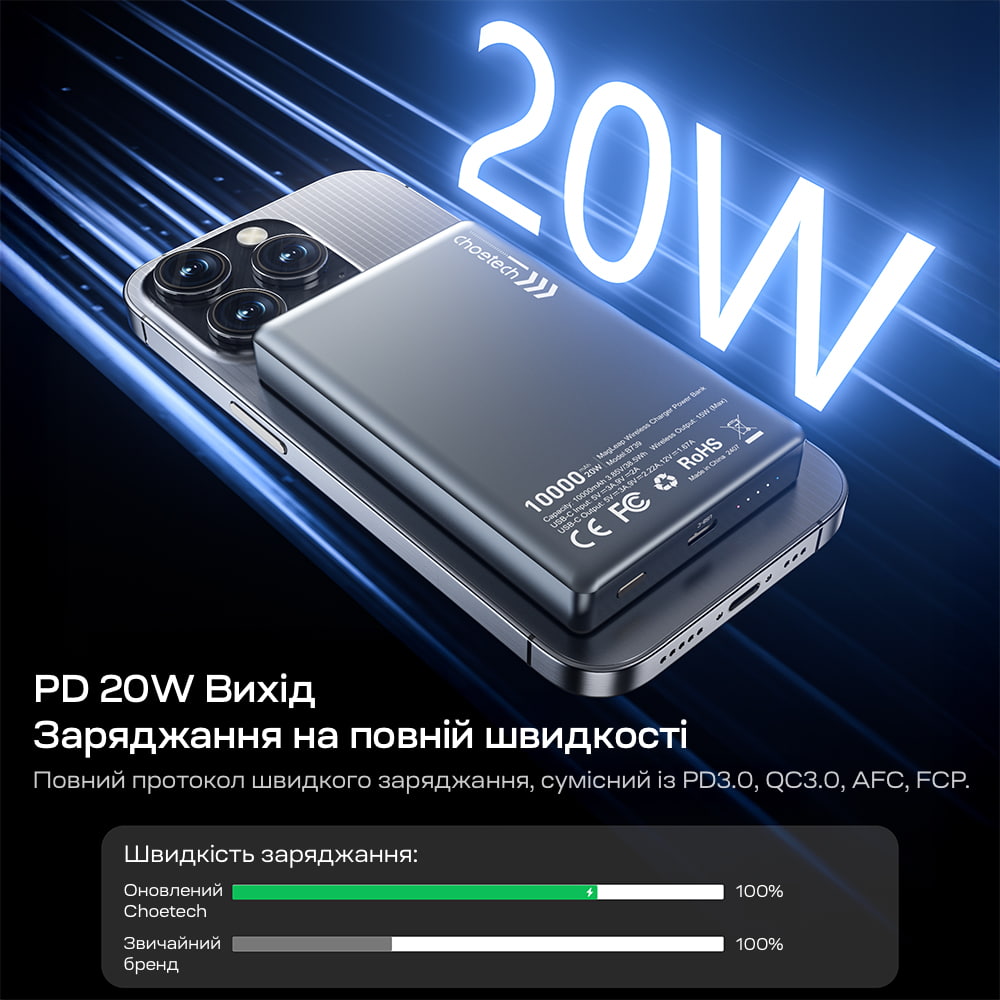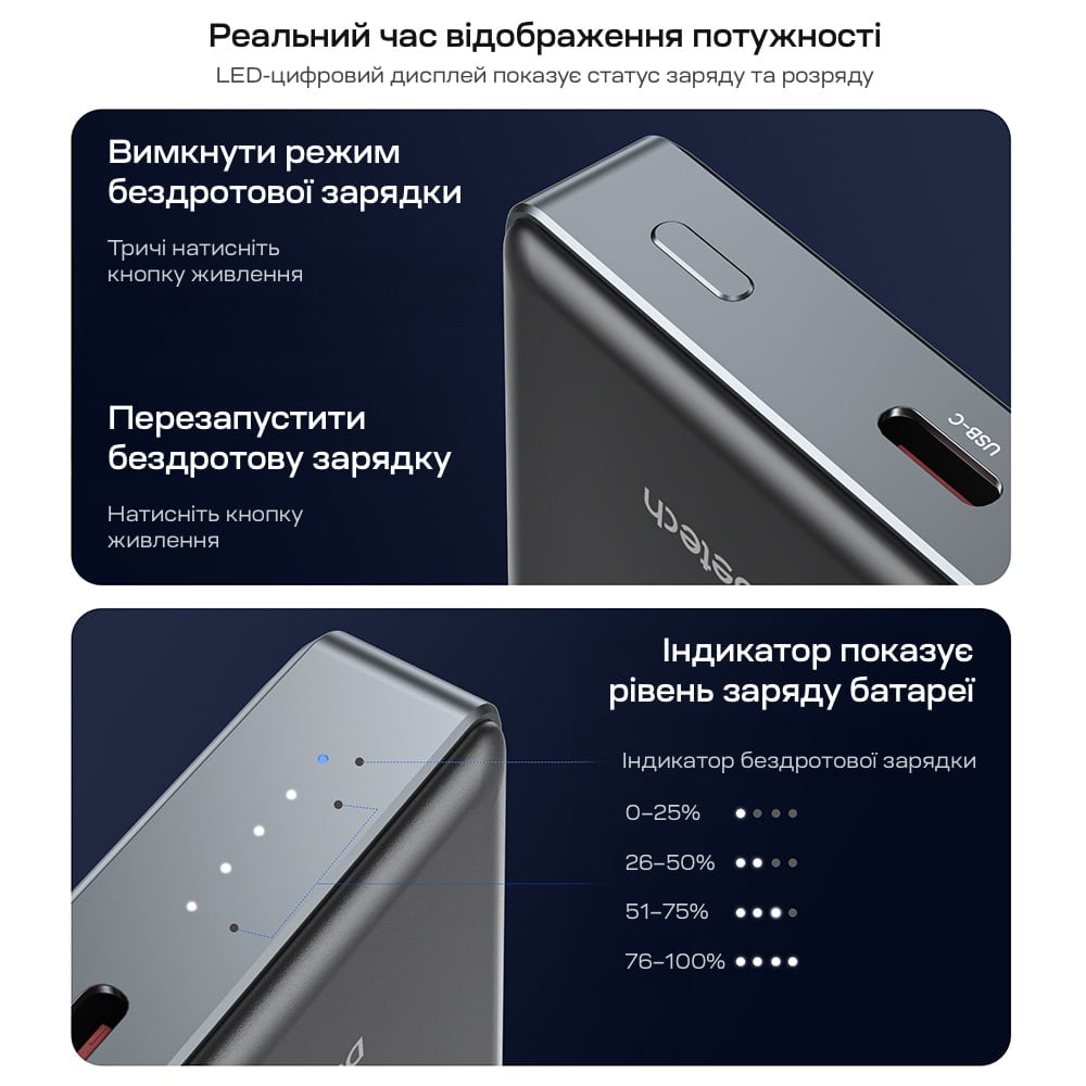 Повербанк з ємністю батареї 10000 мА·год, з бездротовою магнітною зарядкою; тип батареї: літій-полімерна (Li-pol); інтерфейси: вхід Type-C: 5V/2.4A, 9V/2A, 12V/1.5A (макс. 18 Вт), виходи: Type-C: 5V/3A, 9V/2.22A, 12V/1.67A (макс. 20 Вт); бездротова зарядка: 5V/1A, 5V/1.5A, 5V/2A, 5V/3A (макс. 15 Вт); LED-індикація; протоколи швидкого заряджання PD3.0 / QC3.0 / AFC / FCP / Apple2.4A; розміри 105 / 66 / 14.6 мм