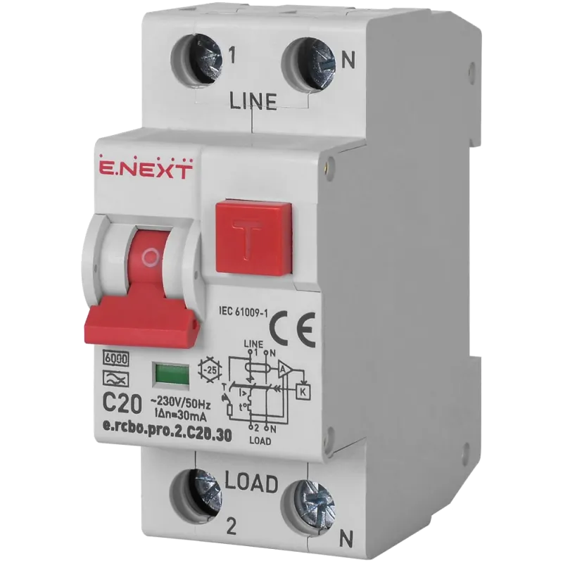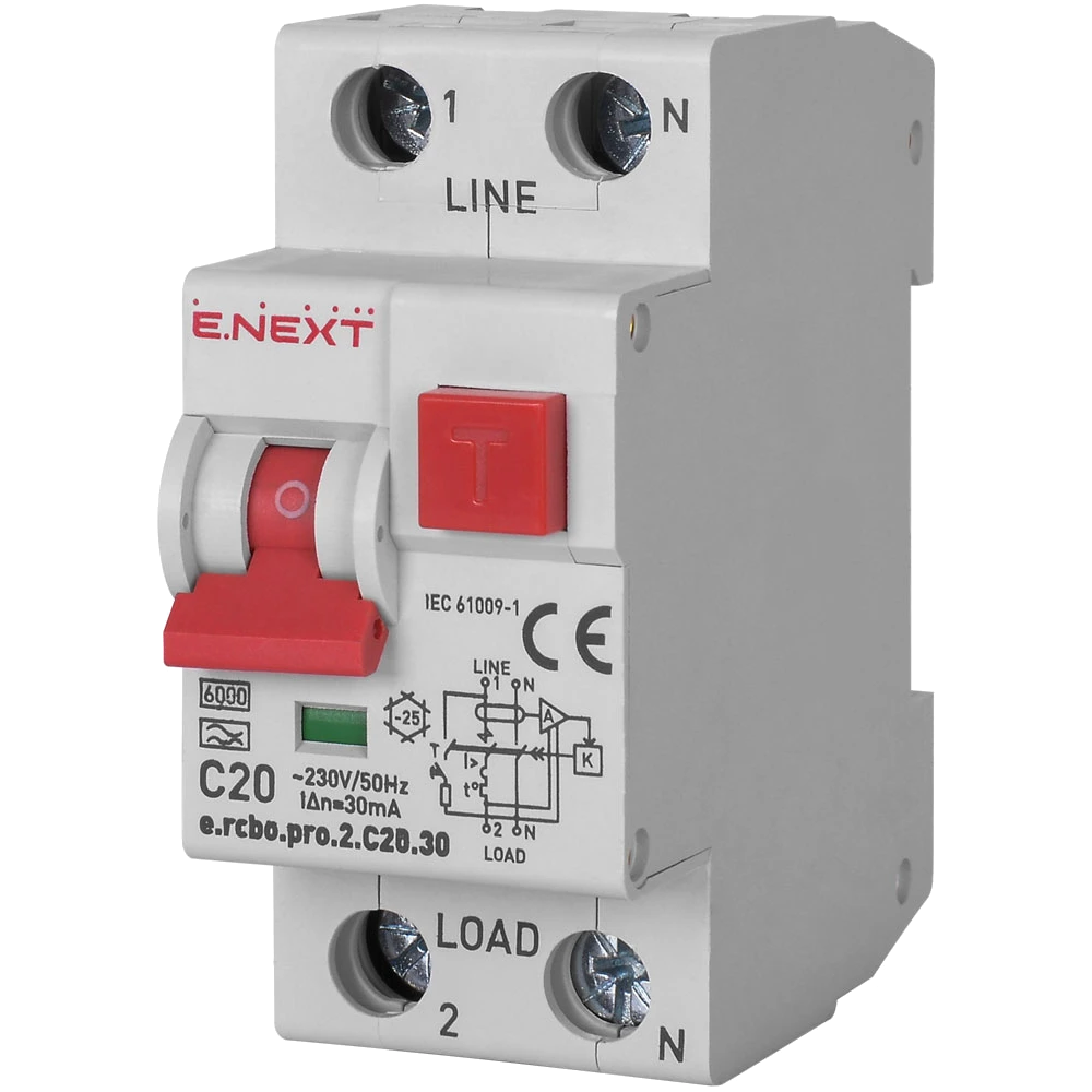 Вимикач диференціального струму із захистом від надструмів Enext e.rcbo.pro.2.C20.30, 1P+N, 20А, С, тип А, 30
