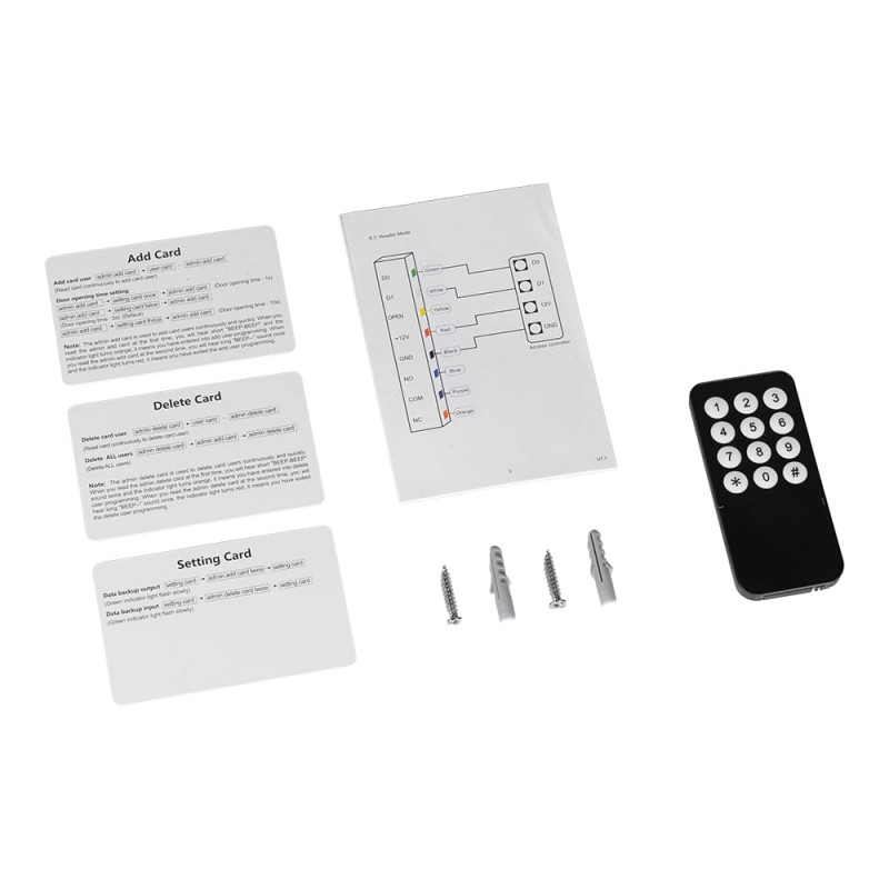 Автономний контролер/зчитувач EM-Marine 125 kHz та Mifare 13.56MHz, водонепроникний; одне реле (max 1 А); 10000 користувачів; дальність зчитувача карт 2-5 см; час відчинення дверей 0-99 с (налаштовується); програмується за допомогою майстер-карт чи пульта дистанційного керування; живлення DC 12 В, споживання в режимі очікування 30 мА; матеріал корпусу ABS-пластик; ступінь захисту IР68; робоча температура від -45°C до +60°C; розміри 82 / 42 / 15 мм