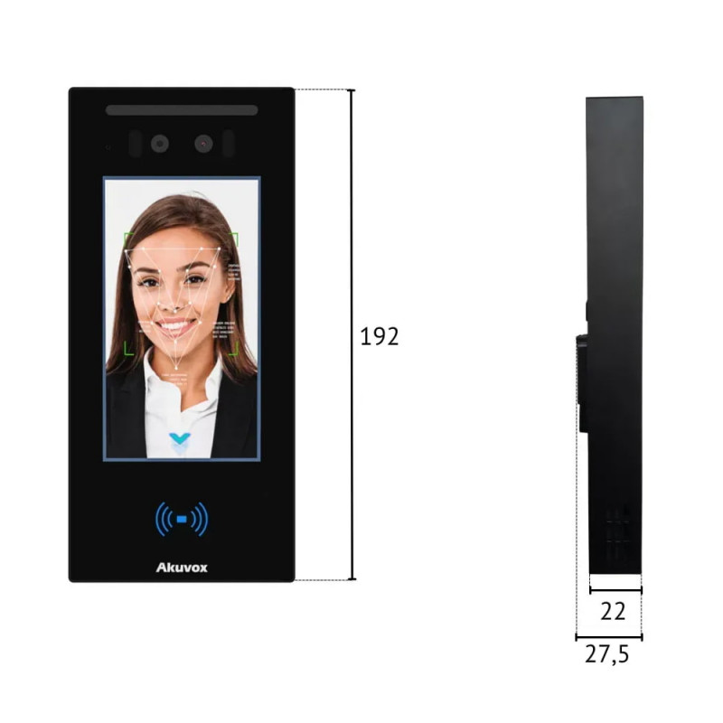 Біометричний термінал контролю доступу з розпізнаванням облич та зчитувачем карт Mifare; підтримка багатофакторної ідентифікації: розпізнавання облич, картка Mifare, NFC, QR-код, Bluetooth, PIN, мобільний застосунок; камера з подвійним об’єктивом з роздільною здатністю 2 Мп; IPS дисплей 5" з роздільною здатністю 1280x720; точність розпізнавання облич 99.7%, швидкість 0.2 с, виявлення маски; ємність памʼяті: до 20000 облич та 20000 карт, до 50000 подій; ІЧ та LED підсвічування; порт Ethernet RJ45 10/100M; підтримка ONVIF; інтерфейси: Wiegand, RS485, реле для керування замком, один вхід, тампер; накладний монтаж; живлення 12 В/PoE; пластиковий корпус; клас захисту IP65; робоча температура -20°C~+60°C; розміри 192 / 88 / 27.5 мм