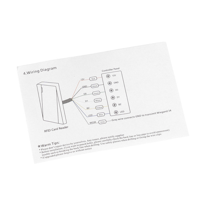 Вуличний водонепроникний зчитувач карток та брелоків стандарту EM-Marine, HID (125kHz) та Mifare (13.56MHz); дальність зчитування 2-5 см, швидкість зчитування 0.1 с; інтерфейс Wiegand 26/34; світлова та звукова індикація; живлення 9-16 В; споживання струму 30 мА; корпус метал + пластик; ступінь захисту IP68; робоча температура -45°C~+60°C; розміри 100 / 50 / 20 мм
