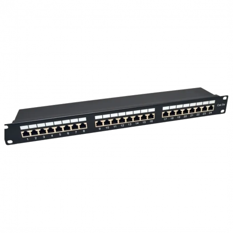 Патч-панель категорії 5е має 24 роз'єми RJ-45. Призначена для комутації між пасивним та активним обладнанням, комп'ютерами, є відмінним рішенням для упорядкування слаботочних систем.