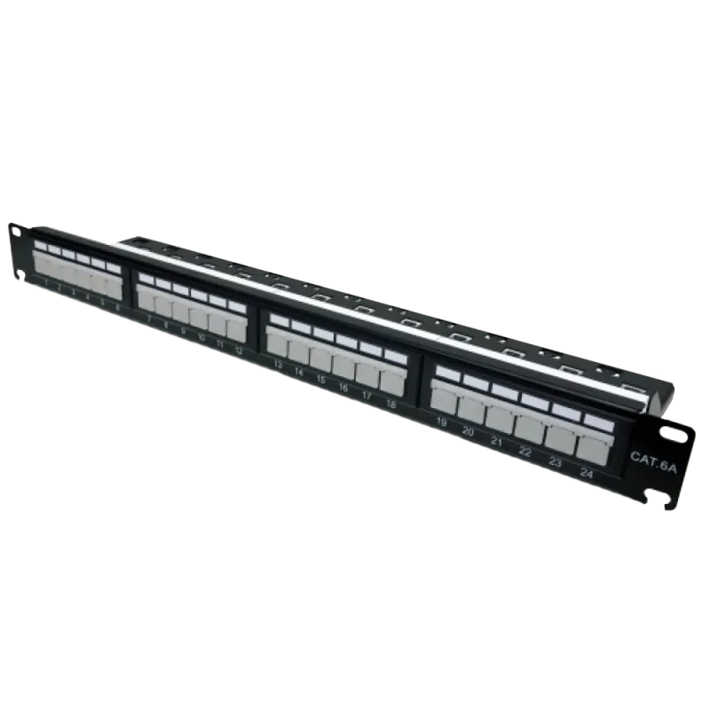 Патч-панель кат. 6а UTP встановлюється в серверну шафу або стійку і використовується для підключення витої пари з боку точки комутації з активним мережевим обладнанням. Установча висота 1U в направляючі 19 дюймів на чотири точки кріплення. Основа панелі виготовлена зі сталі з пластиковими вставками під коннектори RJ-45. Підключення заземлення не перебачено, патч-панель неекранована. На лицьовій стороні патч-панелі розташовані 24 порти з роз'ємами RJ-45 для підключення патч-кордів. Нанесено цифрове маркування з додатковим місцем для підпису портів. В наявності захисні пластикові вставки під порти.