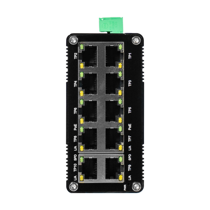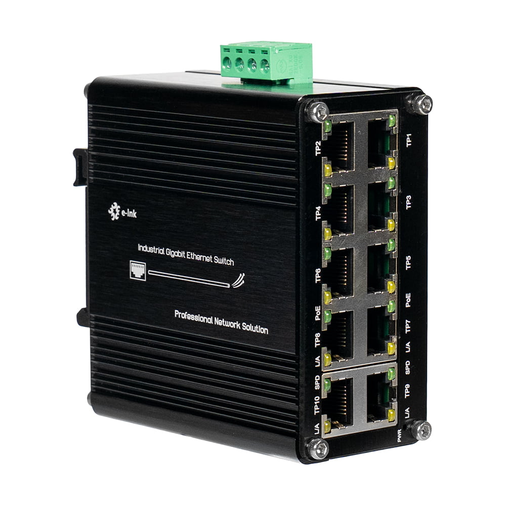 10-портовий промисловий некерований РоE-комутатор з 8-портами PoE 10/100/1000T 802.3at, 2-Port 10/100/1000T RJ45 Uplink; стандарт живлення РоЕ: IEEE802.3at / af, PoE Pin: 4,5 + / 7,8-; загальна потужність <240 Вт; живлення 48-57 В; монтаж на DIN-рейку; клас захисту IP40; робоча температура від -40 до +80 °C; розмір 95 / 88 / 46 мм; вага 300 г