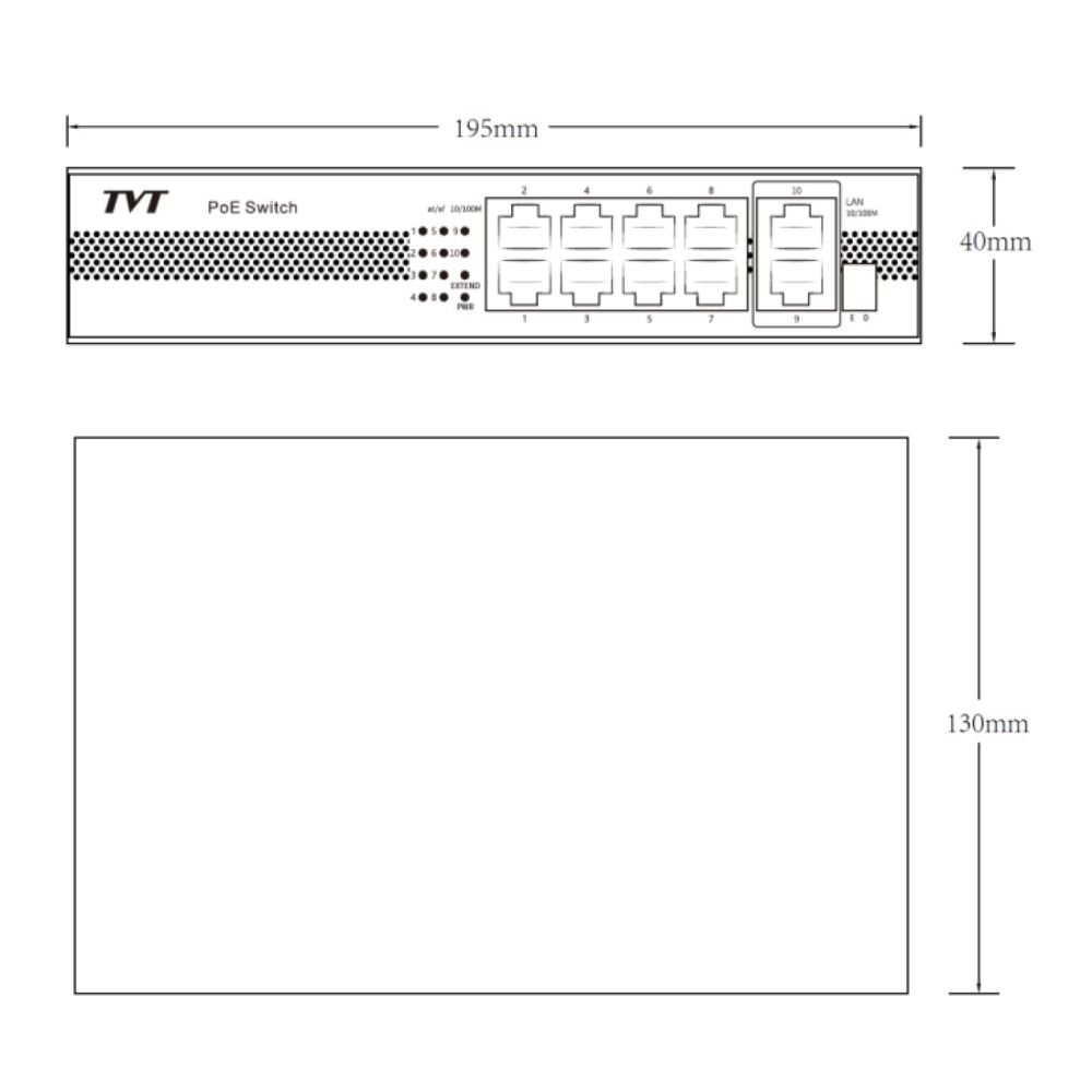 10-портовий PoE-комутатор з 8 портами PoE 10/100Mbps і 2 портами Uplink 10/100/1000Mbps; пропускна здатність: 5.6 Гб/с; стандарт живлення PoE: IEEE802.3at/af, PoE Pin: 1,2 + / 3,6-; максимальна відстань живлення PoE: до 100 м (100 Мбіт/канал), до 250 м (10 Mбіт/канал); порти 1-8 – підтримка режиму дальньої дії до 250 м, VLAN, функції Watchdog; загальна потужність: 120 Вт (до 30 Вт на порт); таблиця MAC-адрес 2K; живлення 100~240V/AC; блискавкозахист: 4KV, захист від електростатичного розряду: 8KV; робоча температура від -20 до +55 °C; розміри: 195 / 130 / 40 мм; вага: 1 кг