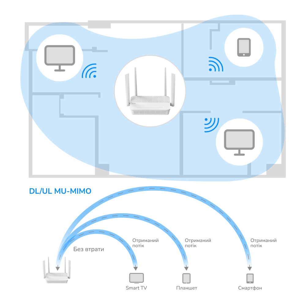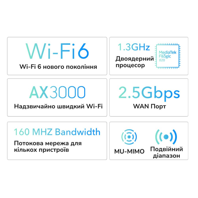 Дводіапазонний WiFi 6 Mesh 2.5G маршрутизатор; WiFi-стандарти 802.11ax/ac/a/b/g/n; 2402 Мбіт/с на 5 ГГц + 574 Мбіт/с на 2.4 ГГц; порти: 2.5G WAN, 4 гігабітних LAN; ширина каналу: 20/40/80/160 МГц; 4 фіксовані антени 5dBi; режими WiFi-маршрутизатор / розширювач / Mesh / AP – точка доступу / WISP; MU-MIMO, OFDMA, Beamforming; DDNS; VPN-клієнт PPTP / L2TP / OpenVPN / WireGuard / IPsec; підтримка сервісу Zerotier; DNS через CloudFlare / Quad9 / Google; IPv6, безшовний роумінг; WPA3; протоколи віддаленого керування TR069 / TR098 / TR111 / TR181; живлення 12 В/1.5 А, блок живлення у комплекті; робоча температура 0°C~+40°C; розміри 173 / 123.8 / 33 мм