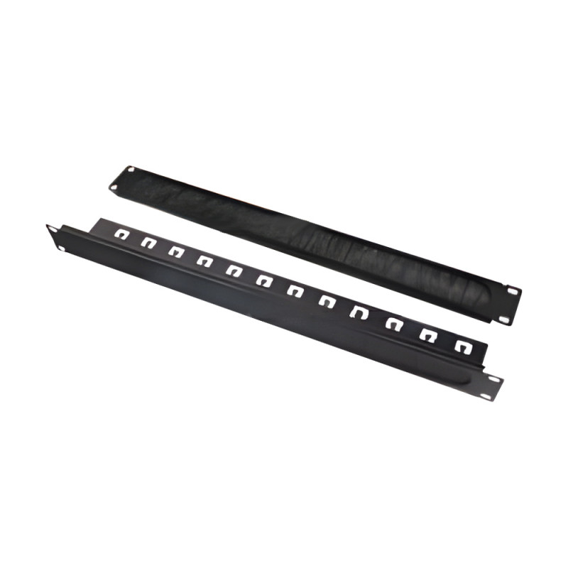 Кабельний організатор з щіткою та 12 кабельними введеннями; встановлення у комутаційні шафи 19"; матеріал пластик та сталь пофарбована у чорний колір; розміри 482 / 43 / 60 мм