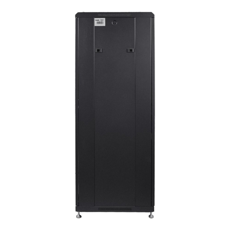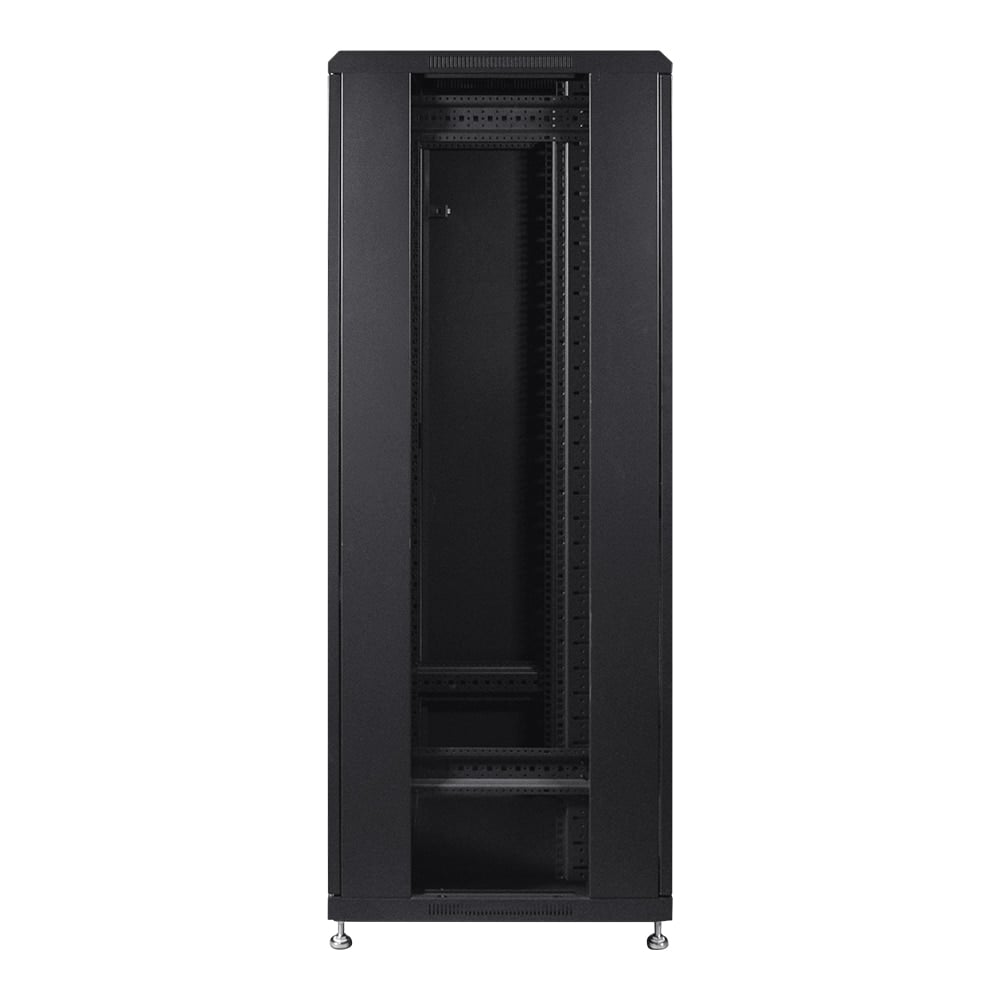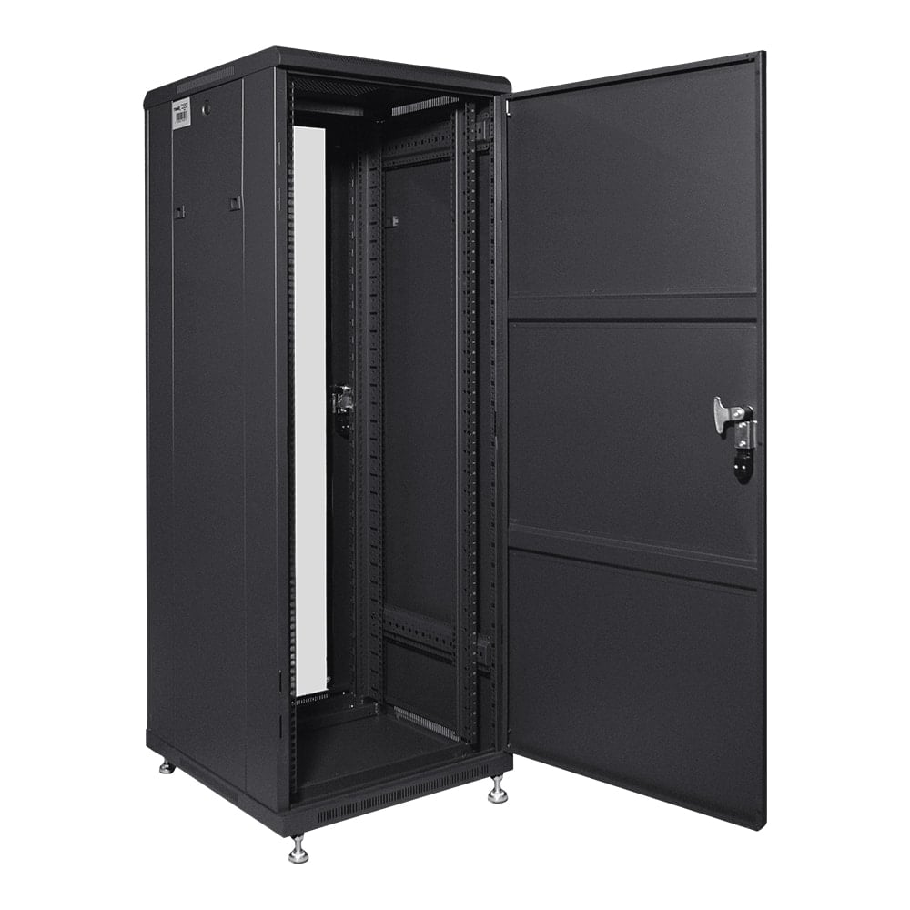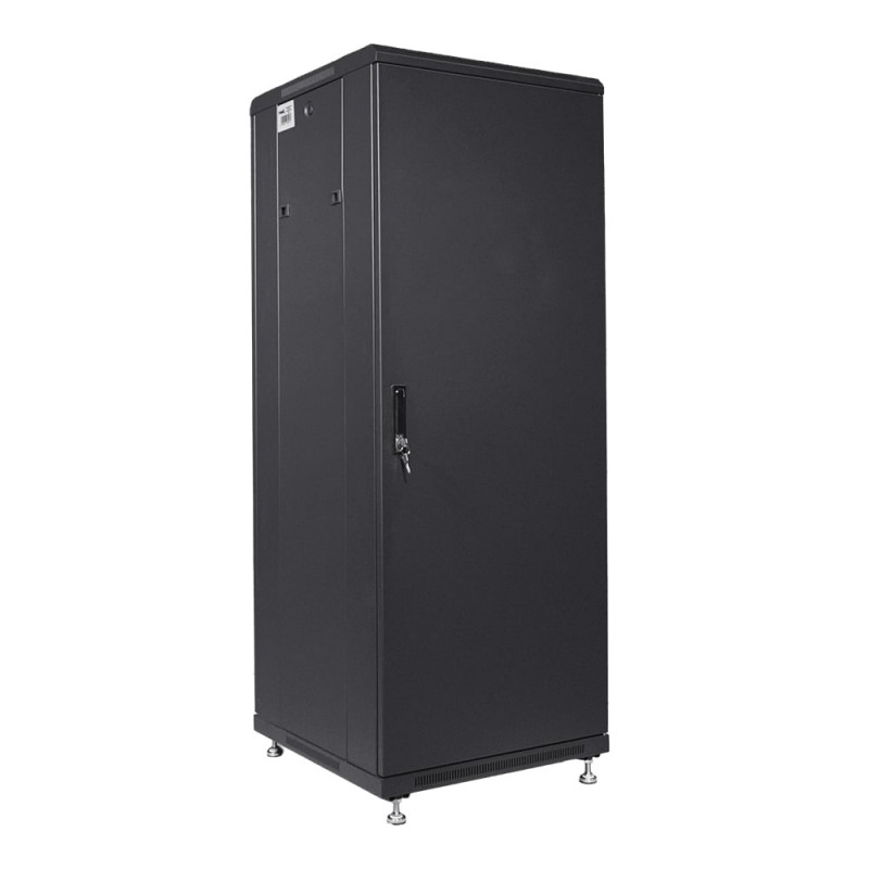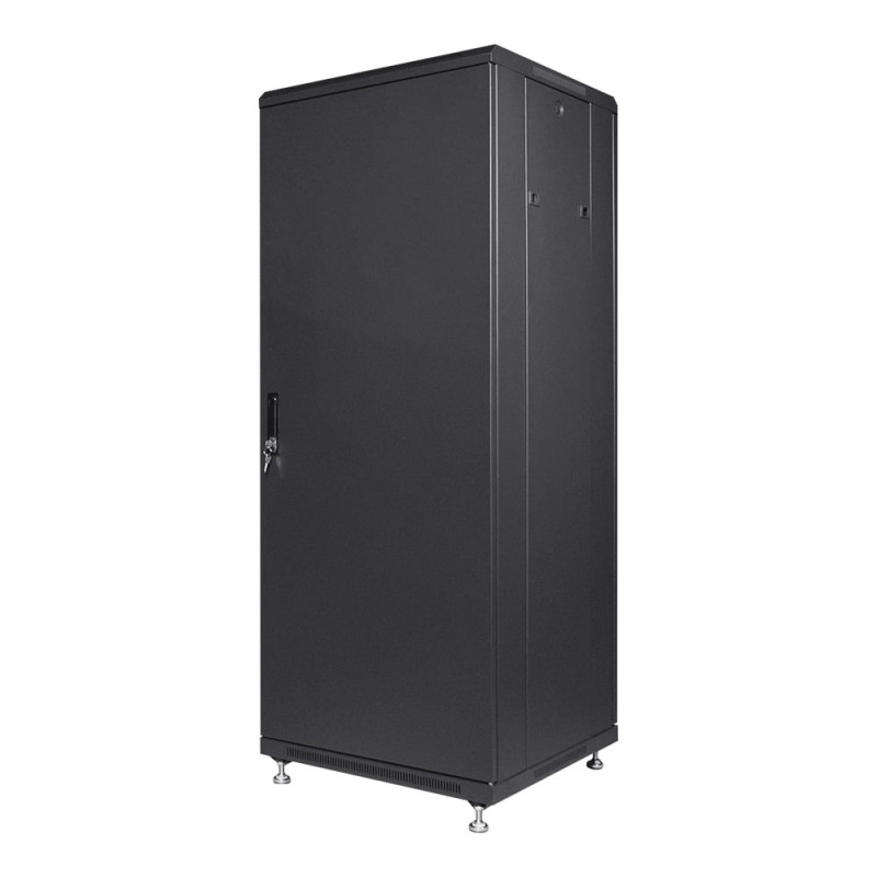 Комутаційна шафа, розбірна, з дверцятами; максимальне статичне навантаження 1000 кг; шафа зачиняється на замок, ключі у комплекті; товщина: вертикальні монтажні рейки – 2.2 мм, монтажна балка – 1.7 мм, бічна панель – 1 мм, передні дверцята – 1.4 мм; задні дверцята – 1.2 мм; рама – 1.2 мм; габаритні розміри: ширина 600 мм, глибина 600 мм, висота 32U – 1610 мм; клас захисту захисту IP20; у комплекті ніжки та коліщатки для зручного переміщення; шафа поставляється в розібраному вигляді у 4 коробках; колір чорний; вага (брутто) 65.2 кг