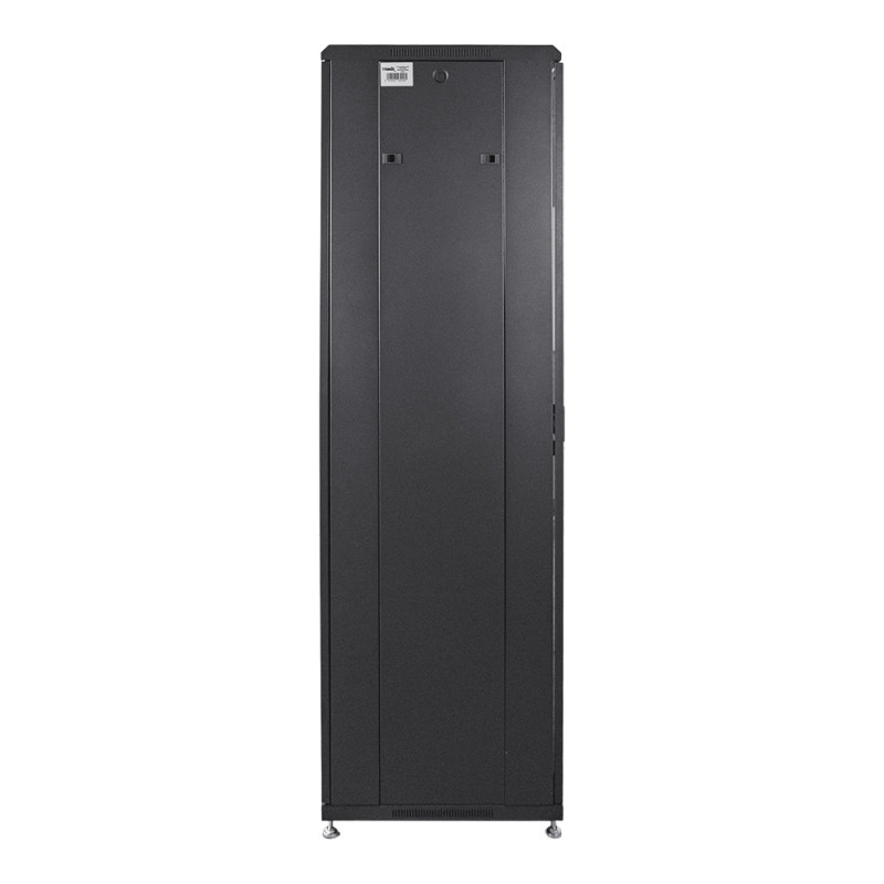 Комутаційна шафа, розбірна, з дверцятами; максимальне статичне навантаження 1000 кг; шафа зачиняється на замок, ключі у комплекті; товщина: вертикальні монтажні рейки – 2.2 мм, монтажна балка – 1.7 мм, бічна панель – 1 мм, передні дверцята – 1.4 мм; задні дверцята – 1.2 мм; рама – 1.2 мм; габаритні розміри: ширина 600 мм, глибина 600 мм, висота 42U – 2055 мм; клас захисту захисту IP20; у комплекті ніжки та коліщатки для зручного переміщення; шафа поставляється в розібраному вигляді у 4 коробках; колір чорний; вага (брутто) 79.8 кг