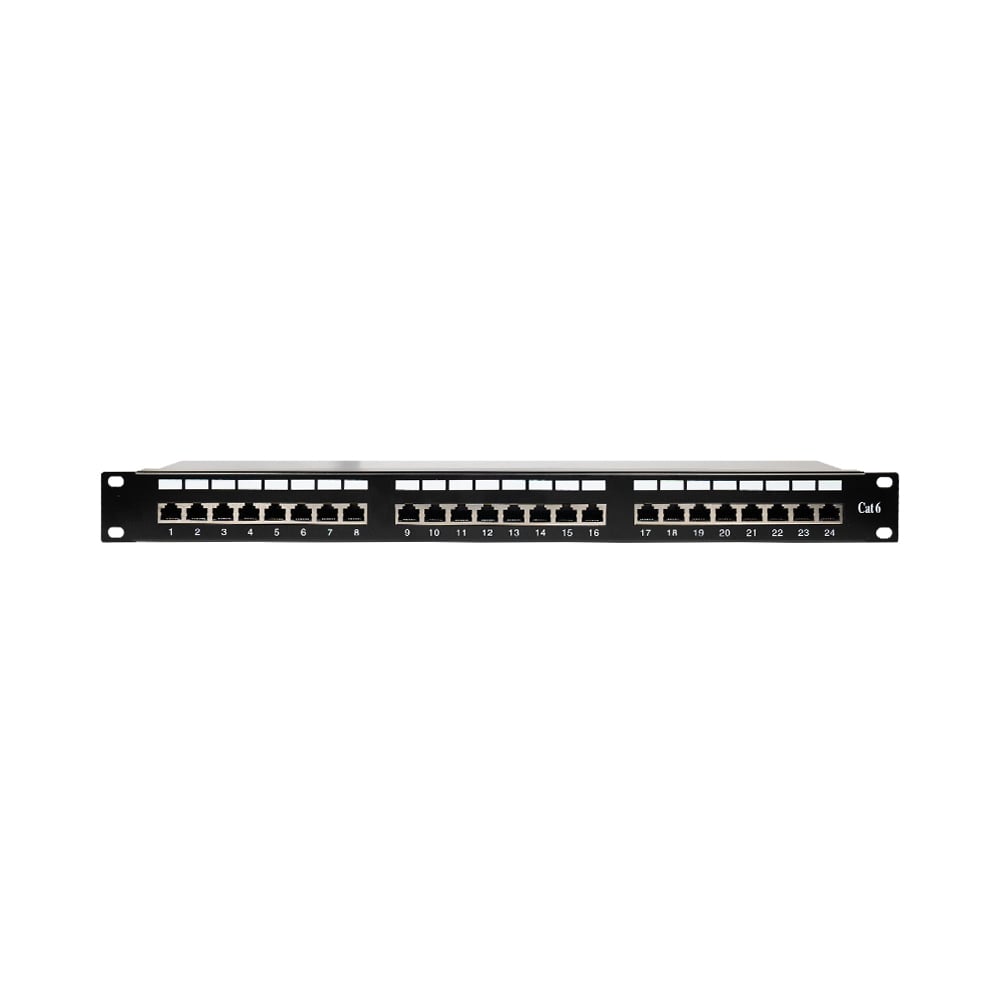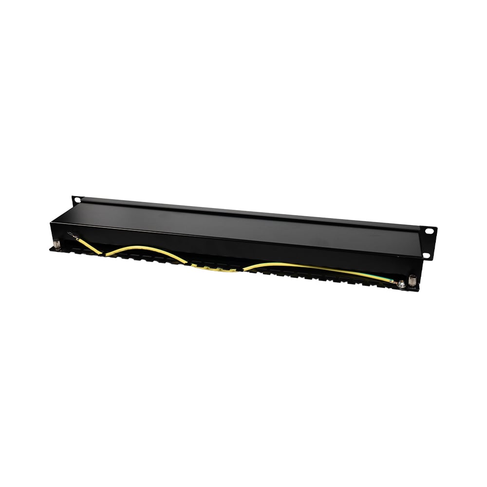 Патч-панель мережева на 24 порти для встановлення у стійки/шафи 19 дюймів; висота 1U; конектор RJ45; кабель FTP (екранована вита пара), категорія CAT5/CAT6; кабель з клемою для заземлення