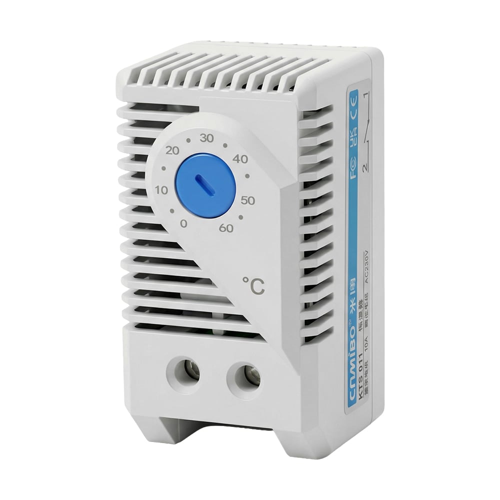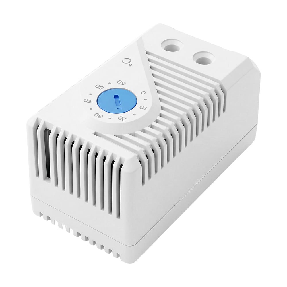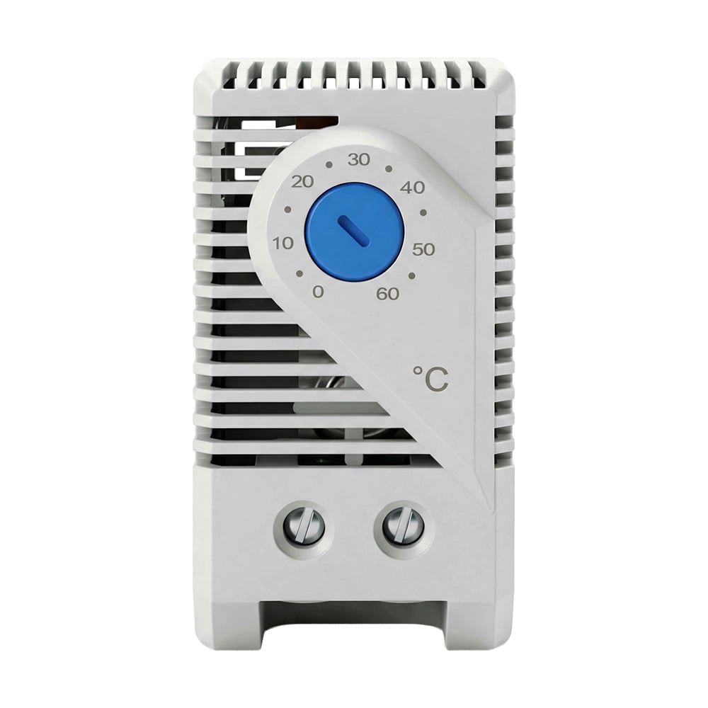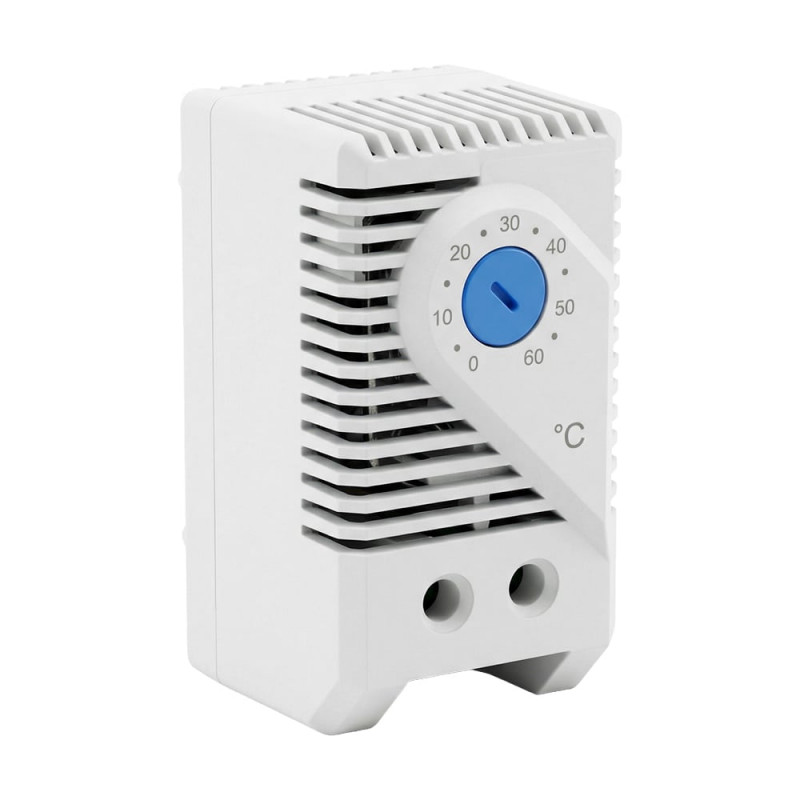 Термостат до комутаційних шаф для керування роботою вентиляторів; температура регулювання від 0°C до 60°C; тиип контакту: нормально-відімкнений (NO); максимальна комутаційна здатність 10 А за AC 250 В; клас захисту IP20; встановлення на DIN-рейку; робоча температура -10°C~+60°C; розміри 60 / 35 / 40 мм