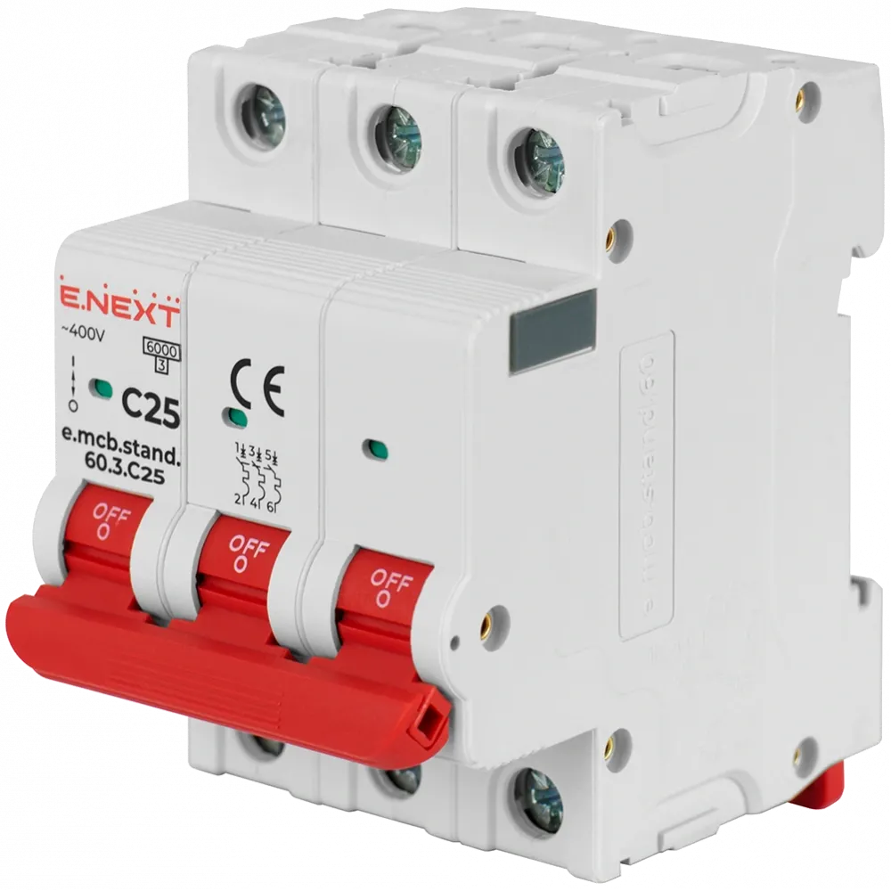 В нашей компании вы можете купить Модульный автоматический выключатель Enext e.mcb.stand.60.3.C25, 3р, 25А, C, 6 кА.