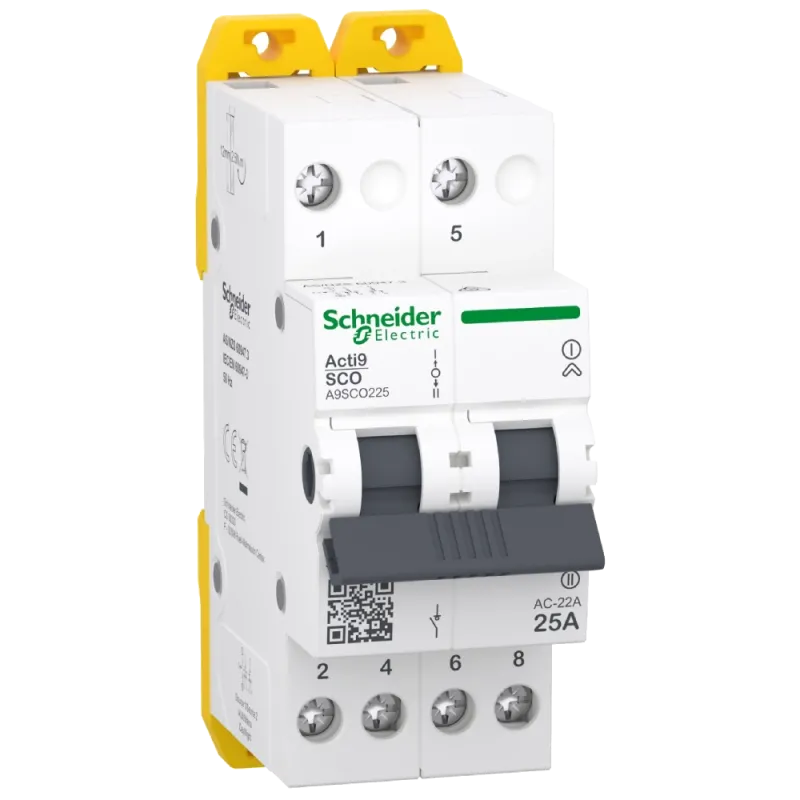 ● Acti9 iSSW - 2 полюсний з номінальним струмом 25A; ● Відповідає стандартам МЕК та AS/NZS 60947-3 та має мартування якості CE та RCM;● Електрична зносостійкість 7 000 циклів, а механічна 10 000 циклів. ● Підключення кабелів з перерізом від 1 мм² до 16 мм²; ● Також гнучких мідних кабелів або кабелів з накінечниками з перерізом від 1 мм² до 10 мм²;● Номінальна робоча напрга 400-415 В змінного струму; ● Номінальна напруга ізоляції 690 В. Номінальна імпульсна витримувана напруга 6 кВ;● Номінальна вмикаюча здатність при короткому замиканні 0.5 кА (пікова).