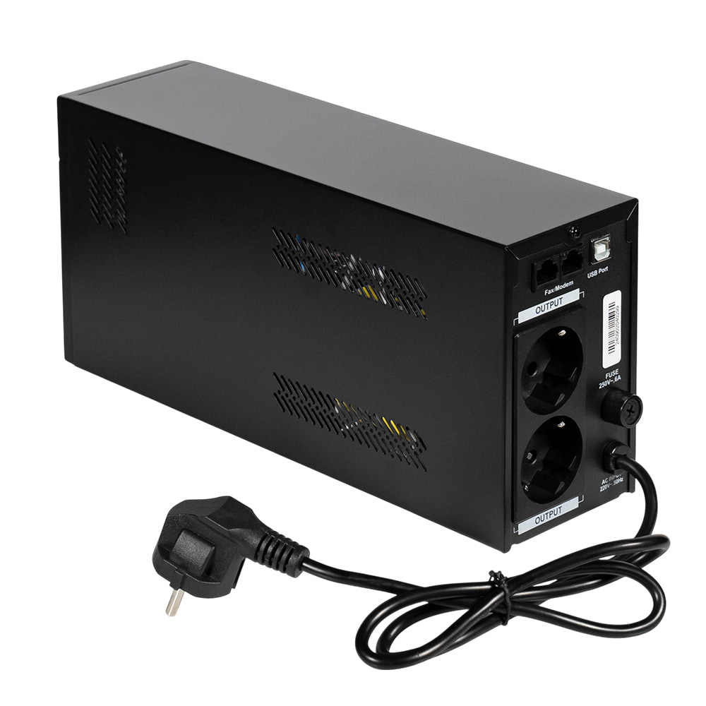 Лінійно-інтерактивне джерело безперебійного живлення з LCD-дисплеєм; вихідна потужність (байпас) - 1200 ВА / 720 Вт, вихідна потужність (робота від АКБ) - 600 ВА / 360 Вт; вхідна напруга 145-290 В АС, 45-65 Гц; вихідна напруга 230±10% В АС, 50±0.1% Гц, апроксимована синусоїда; вбудована акумуляторна батарея LiFePO4 25.6 В 150 Вт·год, час перепідключення 2-6 мс; ККД в режимі АКБ 70%; ток заряду АКБ 1А; повний заряд АКБ за 7 годин; 2 розетки; розміри 305 / 85 / 141 мм; вага 5 кг