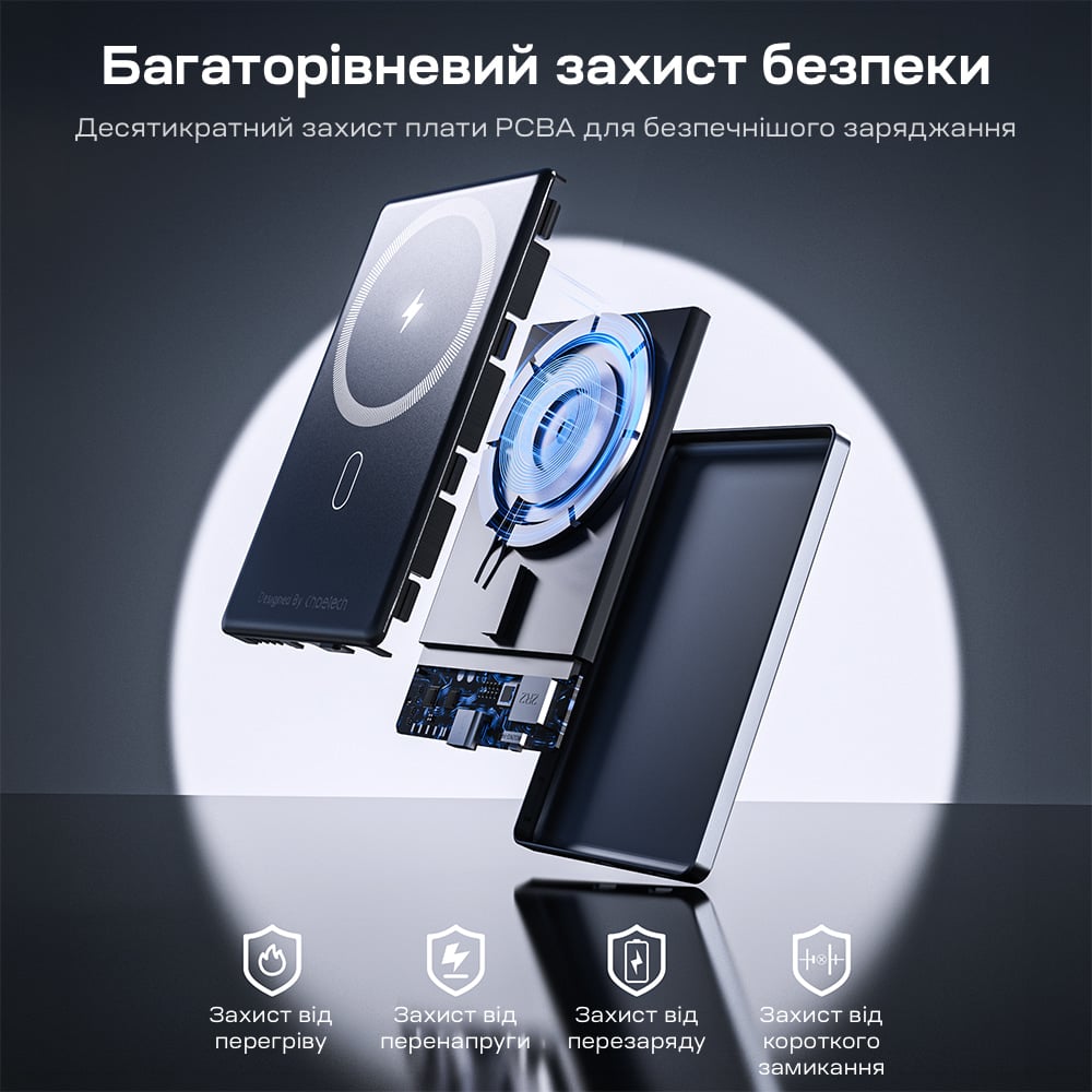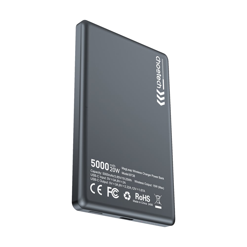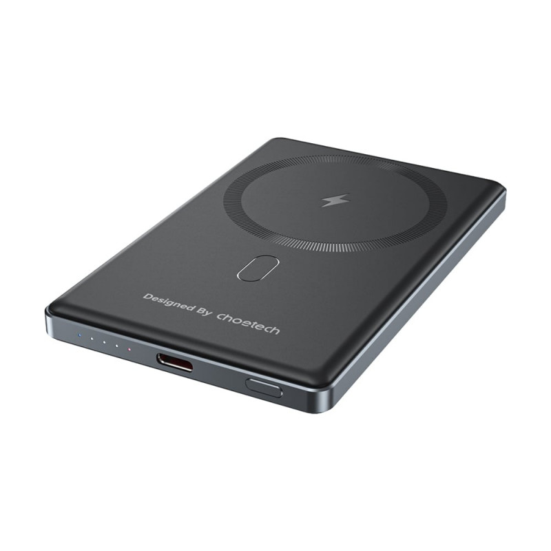 Повербанк з ємністю батареї 5000 мА·год, з бездротовою магнітною зарядкою; тип батареї: літій-полімерна (Li-pol); інтерфейси: вхід Type-C: 5V/2.4A, 9V/2A, 12V/1.5A (макс. 18 Вт), виходи: Type-C: 5V/3A, 9V/2.22A, 12V/1.67A (макс. 20 Вт); бездротова зарядка: 5V/1A, 5V/1.5A, 5V/2A, 5V/3A (макс. 15 Вт); LED-індикація; протоколи швидкого заряджання PD3.0 / QC3.0 / AFC / FCP / Apple2.4A; розміри 105 / 66 / 8.9 мм; у комплекті кабель з роз’ємами Type-C довжиною 30 см
