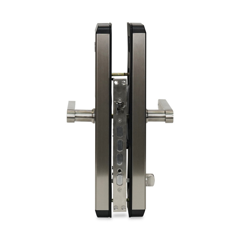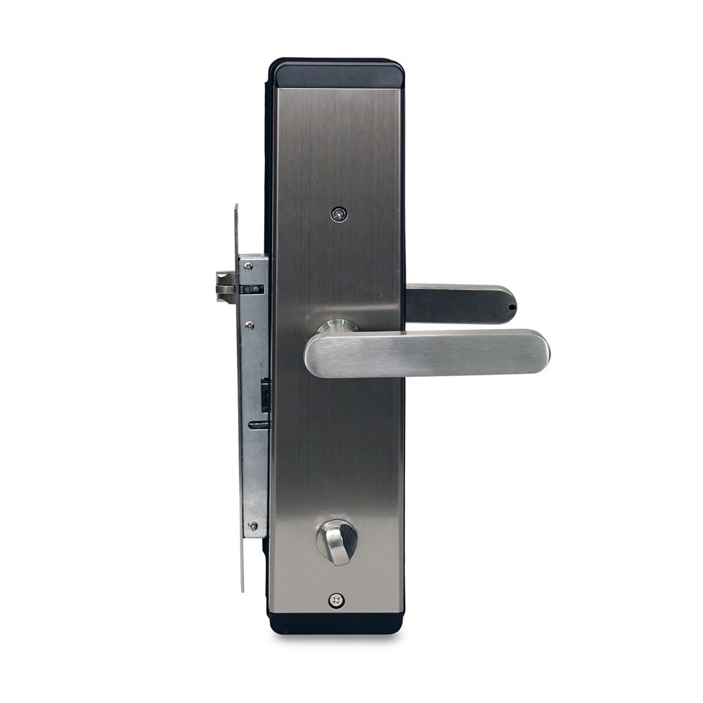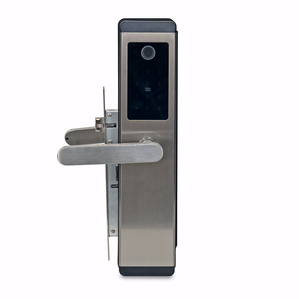 Биометрический автономный электрозамок с Bluetooth и считывателем отпечатков пальцев и карт Mifare 13.56 МГц; отключение с помощью: отпечатка, кода, карты, приложения, ключа; количество пользователей по отпечатку пальца/карте/коду: 200/200/150; разъем microUSB; приложение для работы TTLock, TTHotel; питание 4*АА батарейки; материал и толщина двери: металлическая/деревянная, 40-90 мм; материал корпуса нержавеющая сталь; размеры 350/78/24 мм