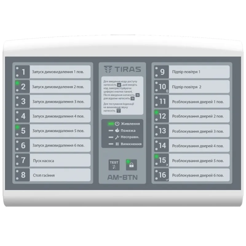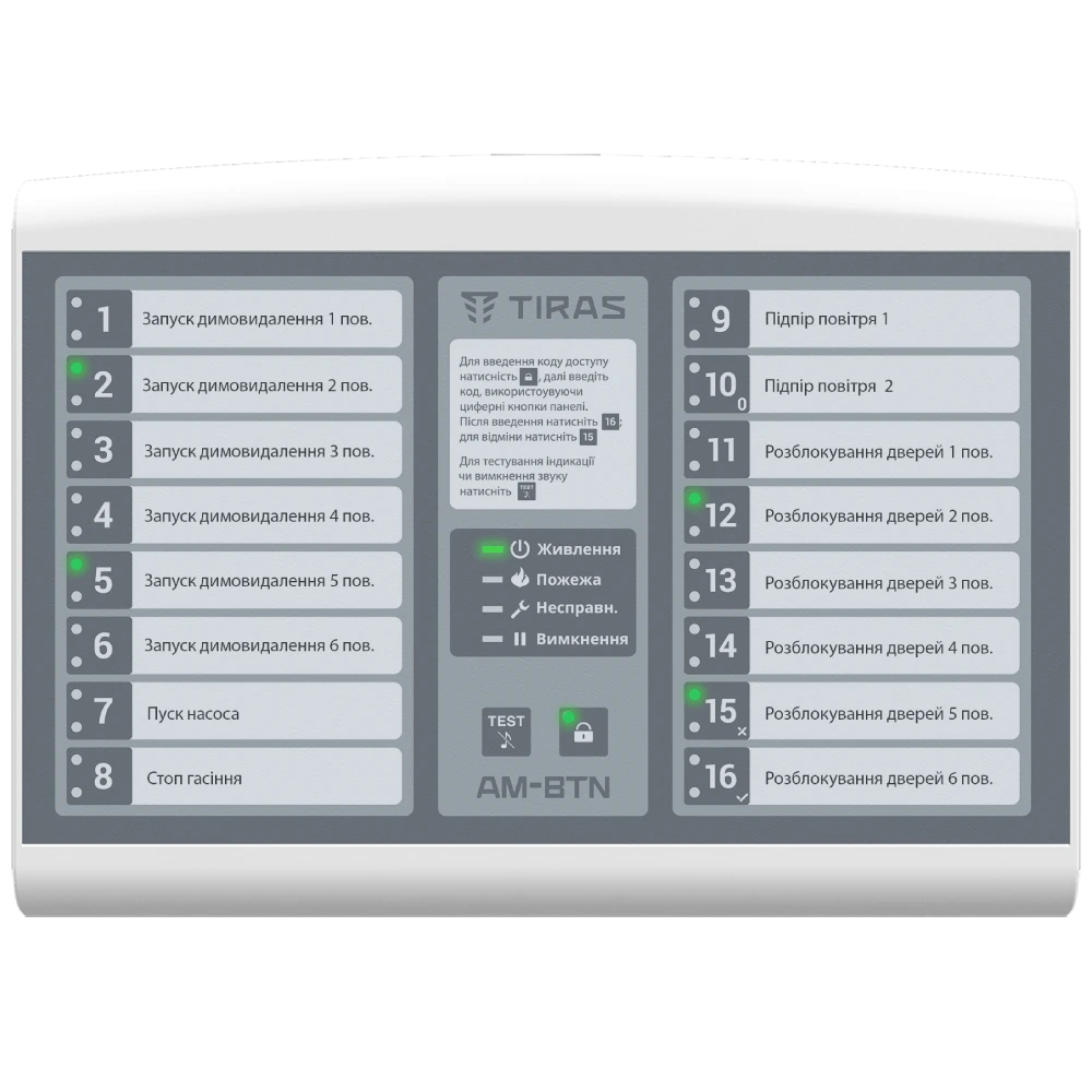 ● Панель відображає стан автоматики для кожної кнопки, а саме: активацію кнопки запуску автоматики (сценарію); завершення активованого сценарію; очікування підтвердження для продовження сценарію натисканням кнопки. При зміні стану автоматики – змінюється стан індикатора;● 16 кнопок керування автоматикою; 16 індикаторів стану; Індикатори «Живлення», «Несправн.», «Вимкнення»; Кнопки «TEST» та «Доступ». Панель не містить вбудованого БЖ. Живлення забезпечується зовнішнім БЖ або ППКП «Tiras PRIME A»;● Габаритні розміри (ШхВхГ), мм, 270х200х52;● Клас захисту ІР30;● Середній наробіток на відмову, год, не менше 40 000;● Напруга живлення 12/24 В