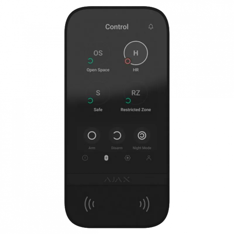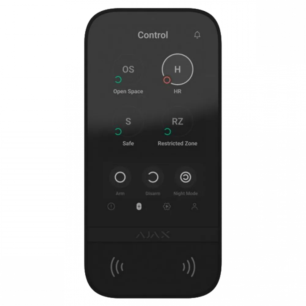 KeyPad TouchScreen успадковує інтерфейс додатків для смартфонів Ajax, забезпечує просту і знайому систему контролю. 5-дюймовий сенсорний екран дозволяє швидко отримати доступ до поточного режиму безпеки будь-якої групи. Він активується при піднесенні руки і має автоматичне регулювання яскравості. Клавіатура має звукову індикацію і може сповіщати про тривоги, затримках при вході/виході, відкритті дверей, коли система знімає з охорони. Гучність регулюється в приложенні Ajax. На клавіатурі також відображається результат перевірки цілісності системи та повідомлень про неполадки при постановці на охорону.