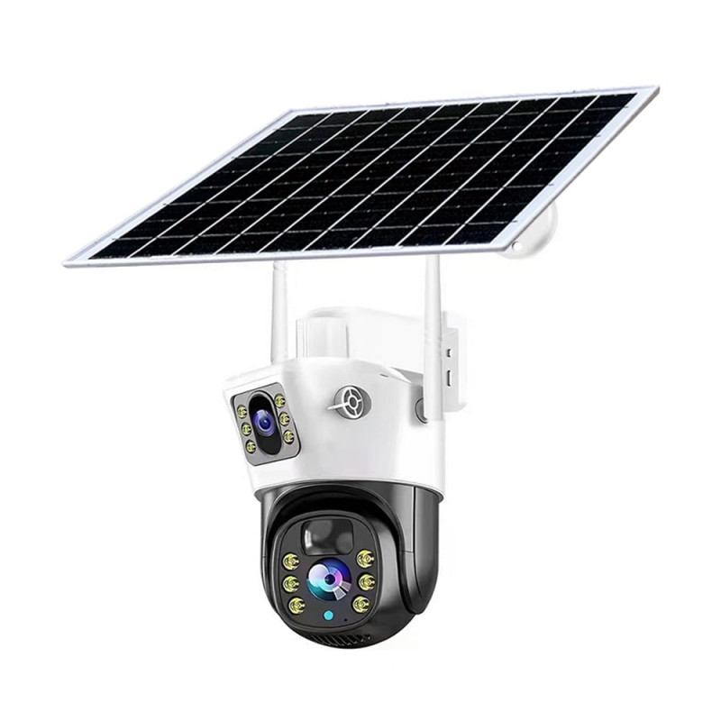 2Mp+2Mp автономна поворотна IP-відеокамера з підтримкою WiFi, з сонячною панеллю, вбудованим акумулятором; матриця 1/2.9″ CMOS; роздільна здатність 2Mp+2Mp (1920*2160); ІЧ-підсвічування + LED-підсвічування до 15 м; відеокомпресія H.265; фіксований об’єктив f=4 мм, кут огляду 110°; кути повороту/нахилу 355°/90°; чутливість 0.1 Люкс@F2.0, 0 Люкс з підсвічуванням; керування через мобільний застосунок V380; стандарт бездротового зв’язку 4G LTE (B1/B3/B7/B8/B20/B28); детекція руху та виявлення людини; живлення: DC 5 В/2 А (роз'єм живлення USB Type-C), сонячна панель потужністю 8 Вт та вбудована акумуляторна батарея ємністю 8000 мА·год; вбудовані мікрофон і динамік; запис на microSD карту до 128 ГБ; ступінь захисту IP66; робоча температура -10°C~+50°C; розміри камери 175 / 205 / 140 мм, панелі 170 / 5 / 240 мм, паковання 270 / 200 / 170 мм; вага 1.6 кг