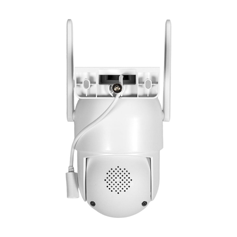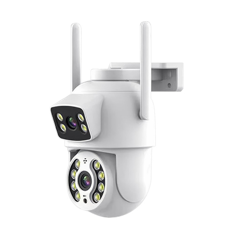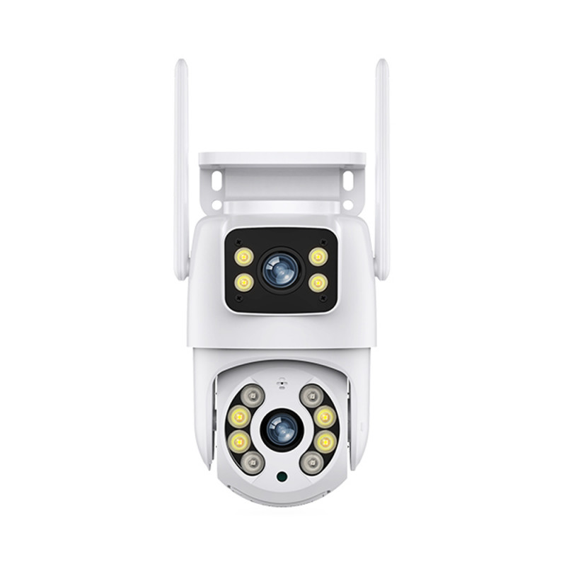 4Mp (2*2Mp) вулична поворотна IP-відеокамера з підтримкою Wi-Fi (2.4 ГГц), з подвійним об’єктивом і подвійним підсвічуванням; об’єктив 3.6 мм + 3.6 мм; матриця 1/2.8″ CMOS x2; роздільна здатність запису 1920*1080 x2; відеокодек H.264+/H.265; кут повороту 0-355°, кут нахилу 0-90°; ІЧ-підсвічування до 20 м + LED-підсвічування до 20 м; віддалений моніторинг на смартфонах (застосунок Tuya); вбудований PIR-датчик руху з дальністю виявлення до 12 м; вбудований мікрофон та розмовний динамік; запис за детекцією на карту micro SD (до 128 Гб); живлення 5 В/1.5 А через інтерфейс USB Type-C; робоча температура -20°C~+55°C; клас захисту IP66; габаритні розміри 158 / 105 / 135 мм; вага 340 г