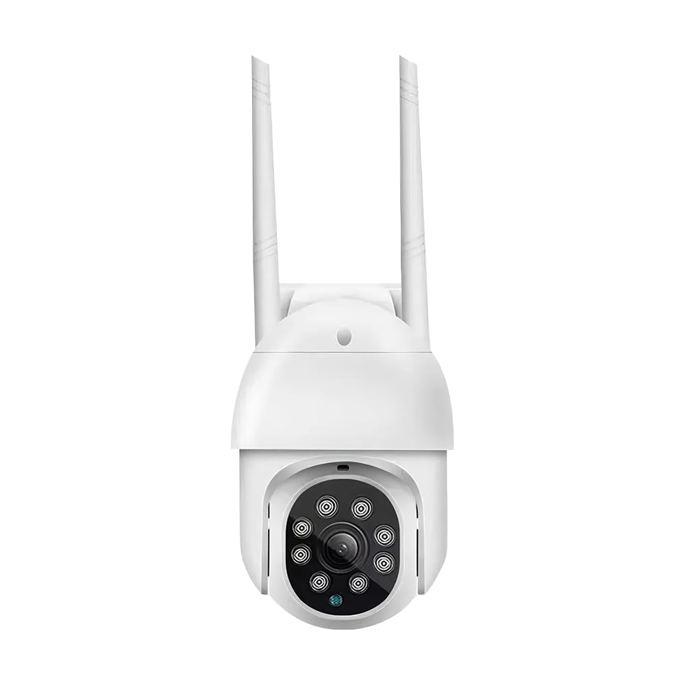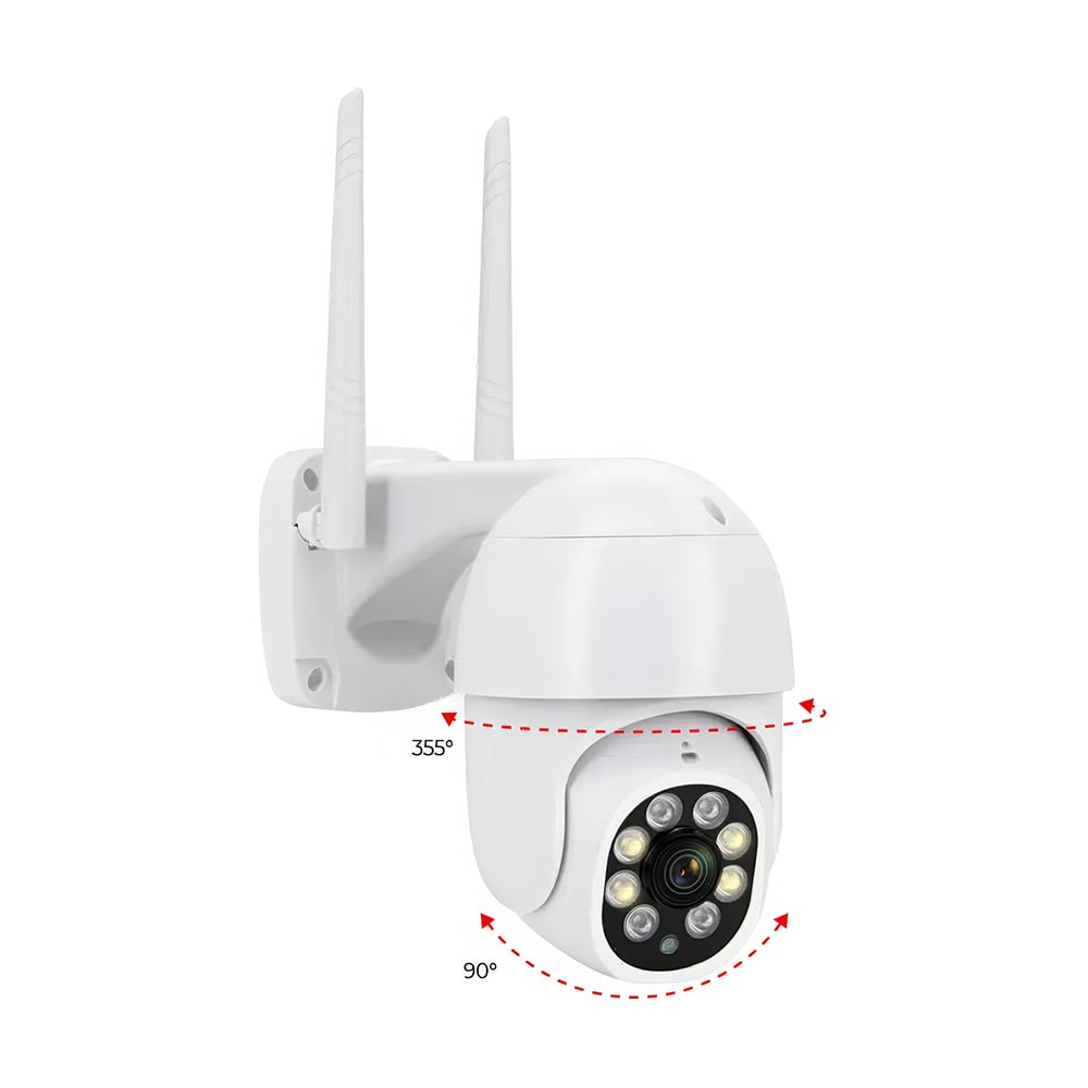 4Mp вулична поворотна IP-відеокамера з підтримкою Wi-Fi (2.4 ГГц) і подвійним підсвічуванням; об’єктив 3.6 мм; матриця 1/3″ CMOS; відеокодек H.264; кут повороту 0-355°, кут нахилу 0-90°; ІЧ-підсвічування + LED-підсвічування до 30 м; віддалений моніторинг на смартфонах (застосунок Tuya); виявлення руху та детекція людини; вбудований мікрофон та розмовний динамік; запис за детекцією на карту microSD (до 128 ГБ); живлення 12 В; клас захисту IP66; габаритні розміри 140 / 135 мм (без антени), кріплення висотою 78 мм