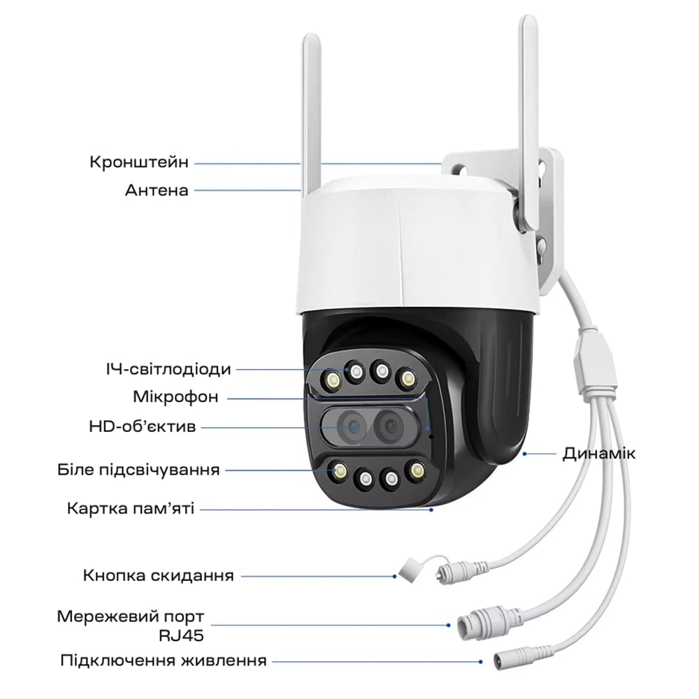 8Mp+8Mp вулична поворотна IP-відеокамера з підтримкою Wi-Fi (2.4 ГГц і 5.8 ГГц), з подвійним об’єктивом і подвійним підсвічуванням; об’єктив 3.6 мм + 8 мм; роздільна здатність запису 3840*2160 x2; кут повороту 0-355°, кут нахилу 0-90°; ІЧ-підсвічування до 30 м + LED-підсвічування до 30 м; віддалений моніторинг на смартфонах (застосунок CamHipro); детекція руху, виявлення людини, автотрекінг; вбудований мікрофон та розмовний динамік; запис за детекцією на карту microSD (до 128 ГБ); живлення 12 В/1 А; робоча температура -10°C~+55°C; клас захисту IP66; габаритні розміри 145 / 140 мм, антени 96 мм, кріплення 62 / 70 мм