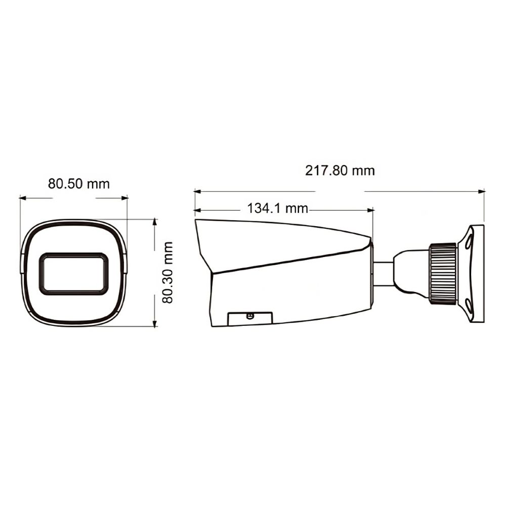 5Mp IP-відеокамера з функціями аналітики; матриця 1/2.7″ CMOS; роздільна здатність 5Mp (2592*1944); фіксований об’єктив f=2.8 мм; кути огляду 99.87° горизонтальний, 70.36° вертикальний; ІЧ-підсвічування до 50 м; відеокомпресія H.265+/H.265/H.264+/H.264; чутливість 0.002 Люкс @F1.6, AGC увімкнено, 0 Люкс з ІЧ; 3 відеопотоки; мережа: RJ45 100M; ONVIF; живлення DC12V/PoE, споживання 10 Вт; 1 аудіовхід, 1 аудіовихід, вбудований мікрофон; 1 тривожний вхід, 1 тривожний вихід; запис на microSD карту (до 256 Гб); ступінь захисту IP67; габаритні розміри 217.8 / 80.5 / 80.3 мм; вага 0.67 кг