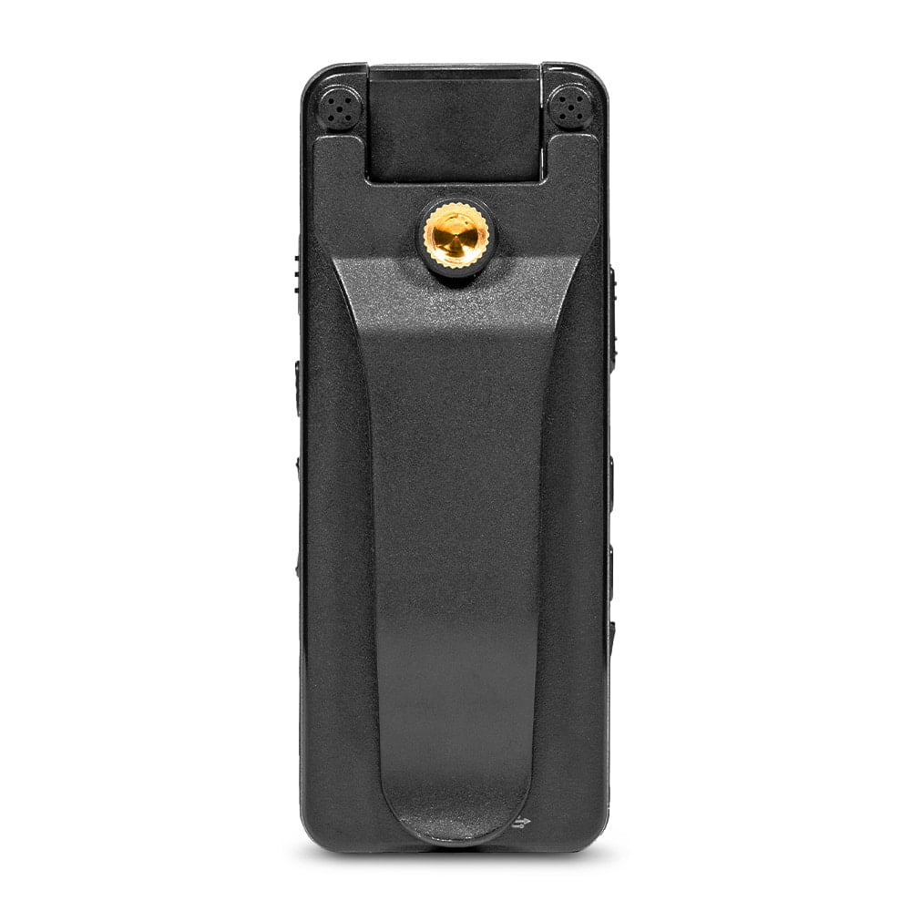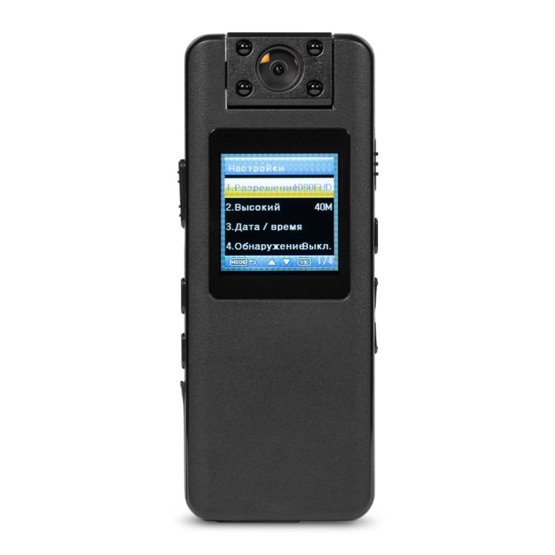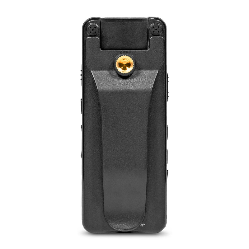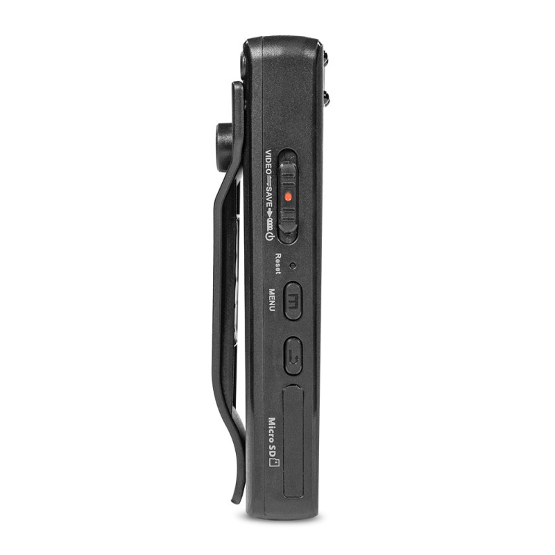 Компактний нагрудний відеореєстратор з поворотним об'єктивом, диктофоном і екраном. Якість запису відео: 1080p (1920x1080)/30fps; 720p (1280x720)/30fps; циклічний запис відео: 5/10 хв. Роздільна здатність фото: до 40 Мп. Кут огляду: 160°. Поворотний об’єктив 180°. ІЧ-підсвічування: до 5 м. РК-екран 1.3". Запис на карту пам'яті до 128 ГБ. Запис звуку: до 7 м, vaw 706kB. Роз'єми: micro-USB. Ємність батареї: 2200 mAh. Час роботи: до 10 годин. Ступінь захисту IP65. Габаритні розміри: 96 / 38 / 16 мм. Вага: 80 г. У комплекті магнітна кліпса, шнур micro-USB