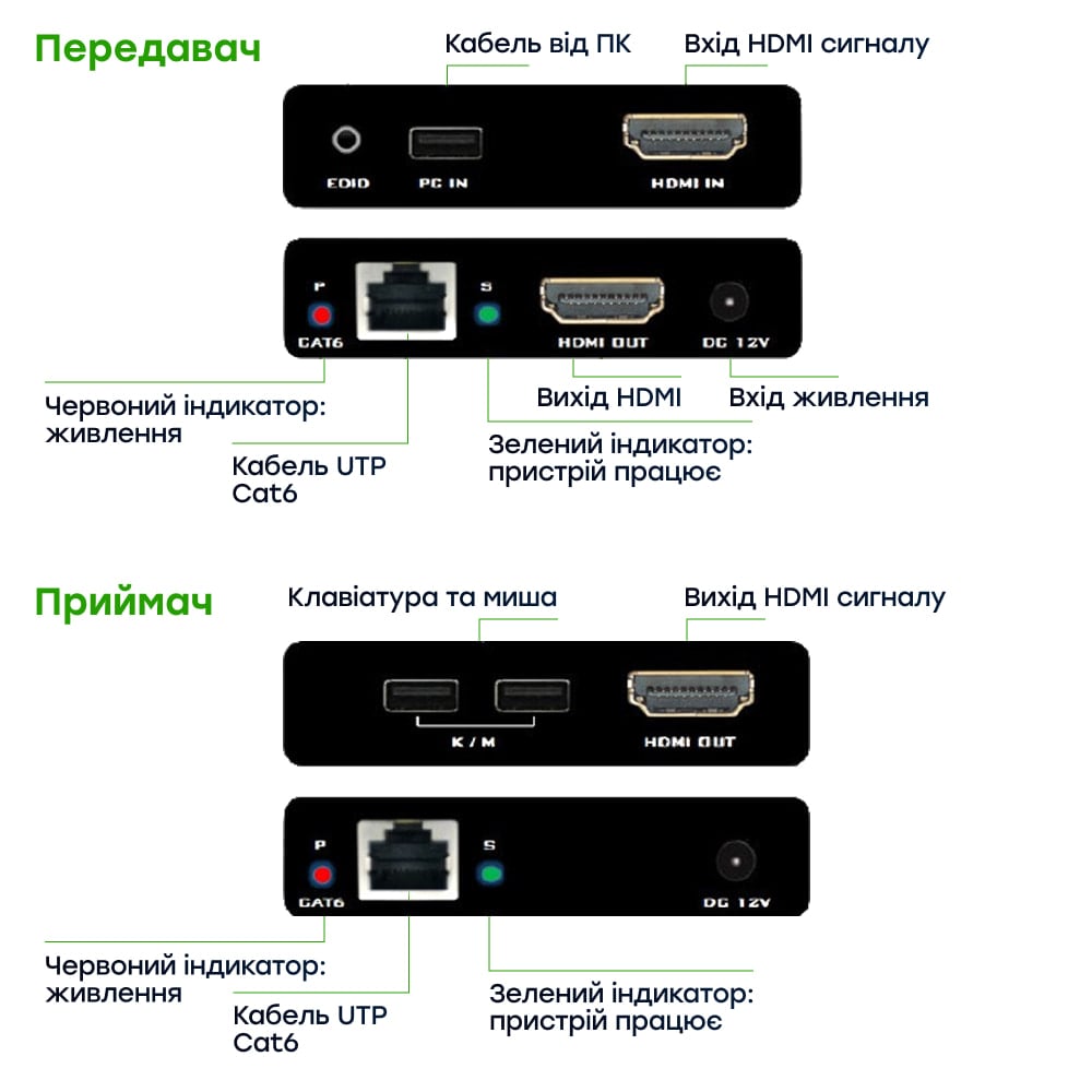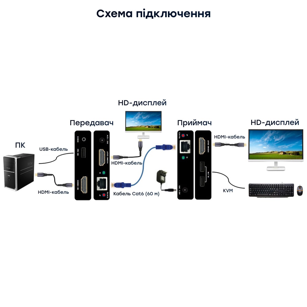 Комплект HDMI-подовжувача з передавача та приймача з підтримкою 1080p/60Hz та швидкістю передачі даних до 6.75 Гбіт/с; призначений для передачі HDMI-сигналу одним кабелем вита пара UTP CAT6/6A/7 до 60 м; відповідність стандартам HDMI 1.3 та HDCP 1.3; наявність локального виходу HDMI (Loop-out) на передавачі для підключення додаткового монітору; підтримка функції KVM для віддаленого керування, EDID для сумісності з будь-яким дисплеєм; живлення DC 12 В, підтримка PoC дозволяє живити і передавач, і приймач одним блоком живлення; потужність споживання 4 Вт; розміри 82 / 85 / 17 мм