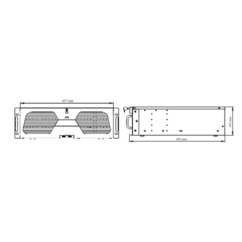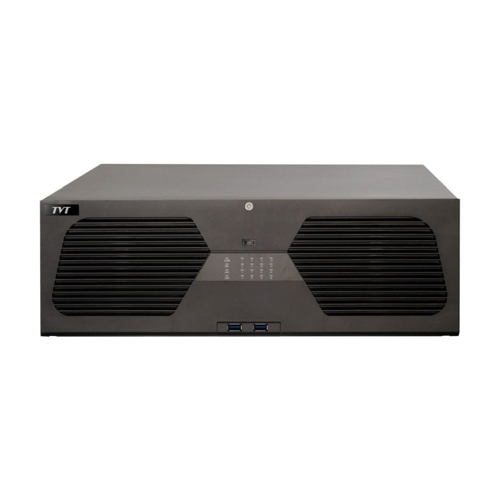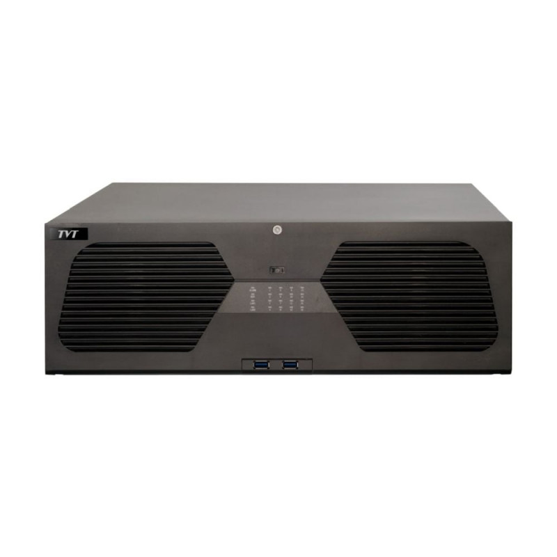 128-канальний мережевий відеореєстратор з підтримкою інтелектуальної відеоаналітики, з максимальною роздільною здатністю 16MP; відеокодек H.265+, H.265S, H.265, H.264; запис: 16Mp / 12MP / 8MP / 6MP / 5MP / 4MP / 3MP / 1080P / 960P / 720P @25fps; вхідний/вихідний потоки 768Mbps/768Mbps; відеовихід: 4x HDMI (HDMI1: 8K, HDMI2: 4K, HDMI3: 4K, HDMI4: Full HD), 1x VGA (Full HD); аудіо: вхід RCA x1 / вихід RCA x1; тривожні: вхід 24 / вихід 8; база даних облич: 32 бібліотеки / 10000 фото облич, обчислення облич: 36 фотографій/сек; перегляд архіву камер: локально/мережею 16/16; мережа: RJ45 1000Mbps x2; інтерфейси: USB 2.0 x3, USB 3.0 x1, RS485, RS232; HDD: SATA x16 до 10 ТБ, E-SATA x2; живлення ATX 275W; розміри 437 / 483 / 143 мм
