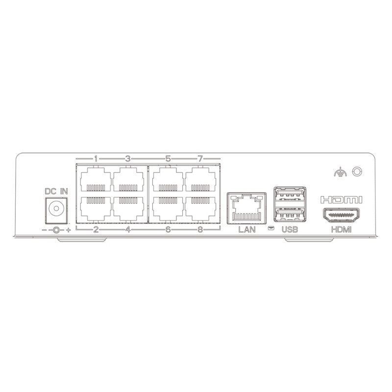 8-канальний мережевий відеореєстратор з 8 портами PoE, з максимальною роздільною здатністю 8MP; відеокодек H.265S, H.265+, H.265, H.264; запис: 8MP / 6MP / 5MP / 4MP / 3MP / 1080P / 960P / 720P @ 25fps; вхідний/вихідний потоки 64Mbps/64Mbps; перегляд архіву камер: локально/мережею 8/8; PoE-порти RJ45 100Mbps x8, загальна вихідна потужність 72 Вт; інтерфейси: мережа RJ45 100Mbps, USB 2.0 x2, HDD: SATA3.0 до 10 ТБ; живлення DC 48В/1.8А; розміри 202 / 202 / 42.5 мм
