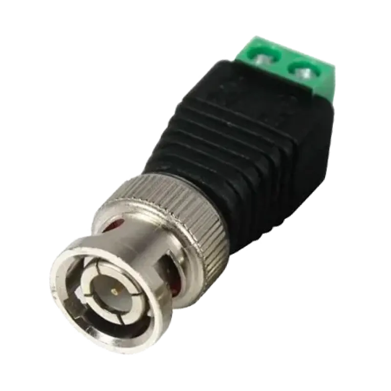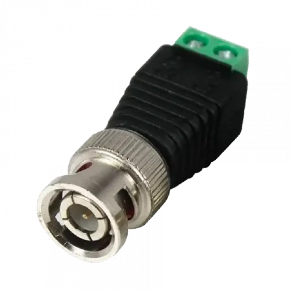 Штекер BNC з клемної колодкою для комутації системи відеоспостереження. Сумісний з кабелем кручений пари, сигнальним кабелем. Кріплення: колодка з гвинтовою закруткою. Матеріал: металеве кільце з мідним наконечником (BNC), полімер (спайка).
